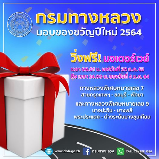 กรมทางหลวงมอบของขวัญปีใหม่ 2564 วิ่งฟรี!! มอเตอร์เวย์ ทางหลวงพิเศษหมายเลข 7 และทางหลวงพิเศษหมายเลข 9