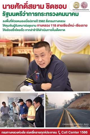 นายศักดิ์สยาม ชิดชอบ รัฐมนตรีว่าการกระทรวงคมนาคมลงพื้นที่ด้วยตนเอง เมื่อวันที่ 26 ตุลาคม พ.ศ.2562 สั่งกรมทางหลวงให้คุมเข้มผู้รับเหมาเร่งลุยงานก่อสร้างทางหลวงหมายเลข 118 สายเชียงใหม่ - เชียงราย ที่กำลังอยู่ระหว่างก่อสร้าง 5 ช่วง รวมระยะทาง 42.8 กิโลเมตร ให้แล้วเสร็จโดยเร็วที่สุด พร้อมกำชับ หากผู้รับเหมาดำเนินการล่าช้ากว่าแผนที่กำหนดต้องดำเนินการขั้นเด็ดขาด