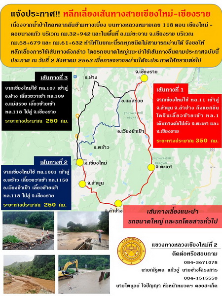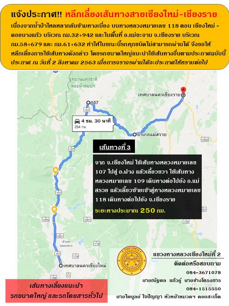 ทั้งนี้ ขอประชาสัมพันธ์ในการใช้เส้นทาง เพื่อการเดินทางจาก เชียงใหม่ ไปพะเยา และเชียงราย ดังนี้.-