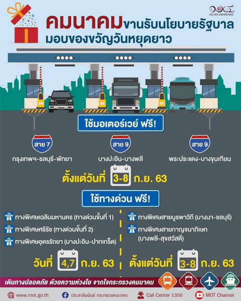 กระทรวงคมนาคมขานรับนโยบายรัฐบาลมอบของขวัญวันหยุดยาว ใช้มอเตอร์เวย์และทางพิเศษบูรพาวิถี ทางพิเศษกาญจนาภิเษก ฟรี ตั้งแต่วันที่ 3-8 ก.ย. 63 ใช้ทางพิเศษเฉลิมมหานคร ทางพิเศษศรีรัช และทางพิเศษอุดรรัถยา (บางปะอิน - ปากเกร็ด)ฟรี วันที่ 4 และ 7 ก.ย. 63