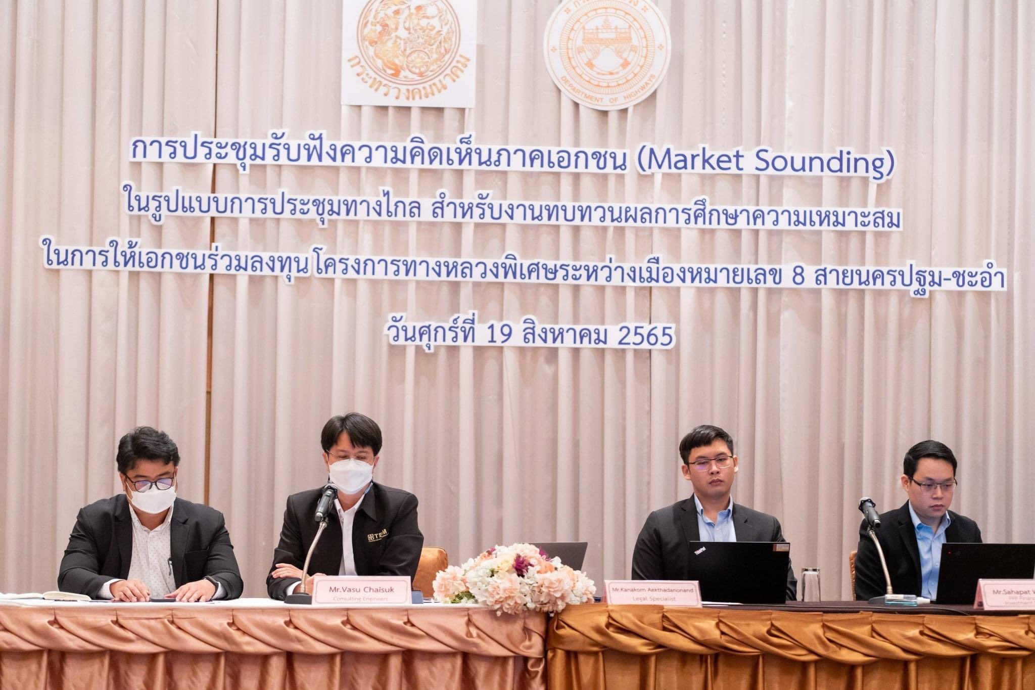 ด้าน ดร.ธนศักดิ์ วงศ์ธนากิจเจริญ ผู้อำนวยการกองทางหลวงพิเศษระหว่างเมือง กล่าวต่อว่า ในช่วงเช้าของวันเดียวกัน (19 ส.ค. 65) ยังมีการจัดประชุมรับฟังความคิดเห็นการทบทวนผลการศึกษาความเหมาะสมในการให้เอกชนร่วมลงทุน หรือ PPP ทางหลวงพิเศษระหว่างเมืองหมายเลข 8 สายนครปฐม-ชะอำ เพื่อรับฟังความคิดเห็นและข้อเสนอแนะจากภาคเอกชนและนักลงทุน (Market Sounding) เพื่อการพิจารณารูปแบบการร่วมลงทุนโครงการ ในรูปแบบการประชุมทางไกลโดยมีผู้สนใจเข้าร่วมกว่า 160 คน ประกอบด้วย สถาบันการเงิน ที่ปรึกษาการร่วมลงทุน ผู้แทนจากกลุ่มผู้รับเหมา หน่วยงานราชการและหน่วยงานรัฐวิสาหกิจ สถานเอกอัครราชทูตประจำประเทศไทย ภาคเอกชน รวมถึงหอการค้าต่างประเทศในประเทศไทย เข้าร่วม สำหรับโครงการ การให้เอกชนร่วมลงทุน หรือ PPP ทางหลวงพิเศษระหว่างเมืองหมายเลข 8 สายนครปฐม-ชะอำ ปัจจุบันได้ดำเนินการสำรวจและออกแบบรายละเอียด และศึกษาผลกระทบสิ่งแวดล้อม (EIA) แล้วเสร็จ รวมถึงคณะกรรมการนโยบายการร่วมลงทุนระหว่างรัฐและเอกชน ได้เคยเห็นชอบในหลักการของโครงการ โดยอนุมัติให้ดำเนินโครงการฯ ในรูปแบบทางหลวงสัมปทาน ด้วยการให้เอกชนร่วมลงทุนในรูปแบบ PPP Net Cost ซึ่งการทบทวนผลการศึกษาได้เสนอให้ดำเนินการปรับปรุงรูปแบบโครงการในส่วนต่าง ๆ เพื่อลดค่าลงทุนโครงการ รวมถึงผลกระทบต่อประชาชน เช่น การปรับรูปแบบโครงการจากถนนระดับดินบนเข็มเป็นรูปแบบสะพานบก ซึ่งช่วยลดผลกระทบทางด้านการเวนคืนที่ดินของประชาชน ลดค่าก่อสร้าง การนำระบบ M-Flow มาใช้กับโครงการแทนการจ่ายเงินที่พนักงาน และลดปัญหาการจราจรติดขัดบริเวณด่านจัดเก็บค่าธรรมเนียมผ่านทาง เพื่ออำนวยความสะดวกให้แก่ให้ผู้ใช้ทาง เป็นต้น ซึ่งสามารถลดมูลค่าก่อสร้างได้กว่า 3,200 ล้านบาท คิดเป็นประมาณ 4.3% เมื่อเทียบกับการศึกษาครั้งที่ผ่านมา รวมถึงมีแนวคิดที่จะทำการก่อสร้างเป็นช่วง เพื่อให้โครงการสามารถพัฒนาได้อย่างรวดเร็ว ตอบสนองต่อความต้องการในการเดินทางและขนส่งสินค้าที่เพิ่มมากขึ้นอย่างต่อเนื่อง