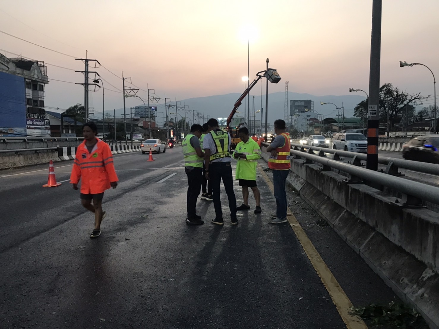 วันนี้(18 มีนาคม 2566) นายวรศักดิ์ วงษ์รอด วิศวกรโยธาเชี่ยวชาญ รักษาราชการแทน ผู้อำนวยการสำนักงานทางหลวงที่ 1 พร้อมด้วยเจ้าหน้าที่แขวงทางหลวงเชียงใหม่ที่ 2 ได้ลงพื้นที่ติดตามสถานการณ์ความเสียหาย บนทางหลวงหมายเลข 11 บริเวณสะพานขัวสรีเวียงพิงค์ และบริเวณแยกศาลเด็ก ภายหลังจากเกิดเหตุการณ์พายุฤดูร้อน ฝนตกหนัก และลูกเห็บพัดถล่มในพื้นที่จังหวัดเชียงใหม่ ส่งผลให้ต้นไม้ เสาไฟฟ้า ป้ายโฆษณาล้มทับทรัพย์สิน สิ่งปลูกสร้าง ได้รับความเสียหาย และกีดขวางทางจราจร รวมทั้งทำให้กระแสไฟฟ้าดับในหลายจุดทั่วเมืองเชียงใหม่