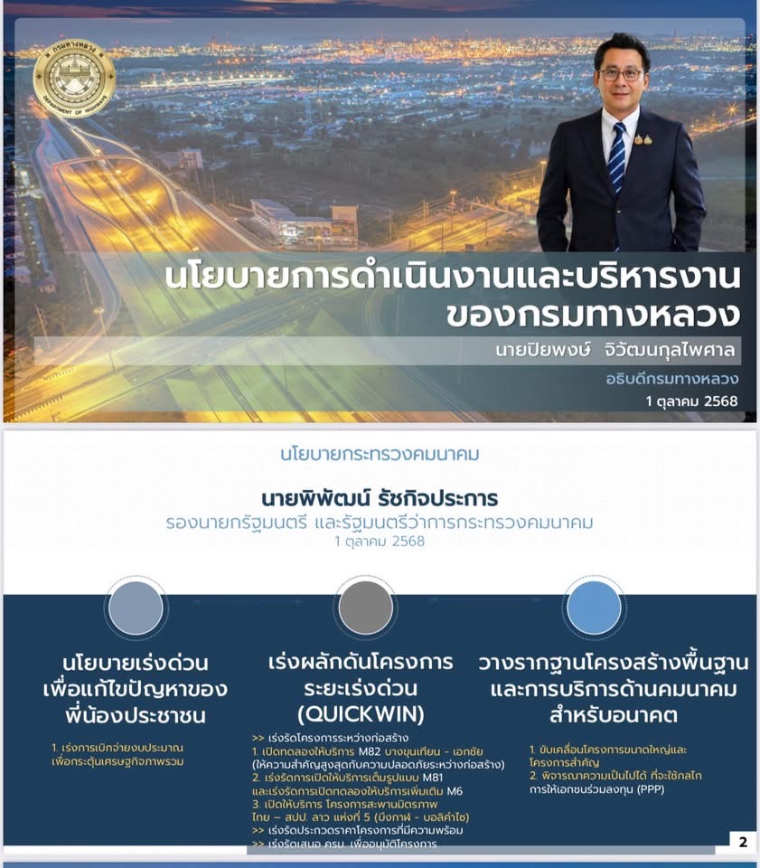 สำนักงานทางหลวงที่ 1 ร่วมรับนโยบายจากนายปิยพงษ์ จิวัฒนกุลไพศาล อธิบดีกรมทางหลวง เพื่อเป็นแนวทางในการขับเคลื่อนภารกิจของทางหลวงสู่ความมั่นคง ยั่งยืน และตอบสนองต่อประชาชนอย่างมีประสิทธิภาพ โดยมีนายสมเดช โสภณดิเรกรัตน์ รองผู้อำนวยการสำนักงานทางหลวง ตำแหน่งที่ 2 เป็นประธาน นำผู้อำนวยการส่วน และหัวหน้างานเข้าร่วมรับฟังนโยบายพร้อมแสดงพลังความร่วมมือในการพัฒนาโครงสร้างพื้นฐานของประเทศ ผ่านสื่ออิเล็กทรอนิกส์ ณ ห้องประชุมชั้น 3 สำนักงานทางหลวงที่ 1 (เชียงใหม่)