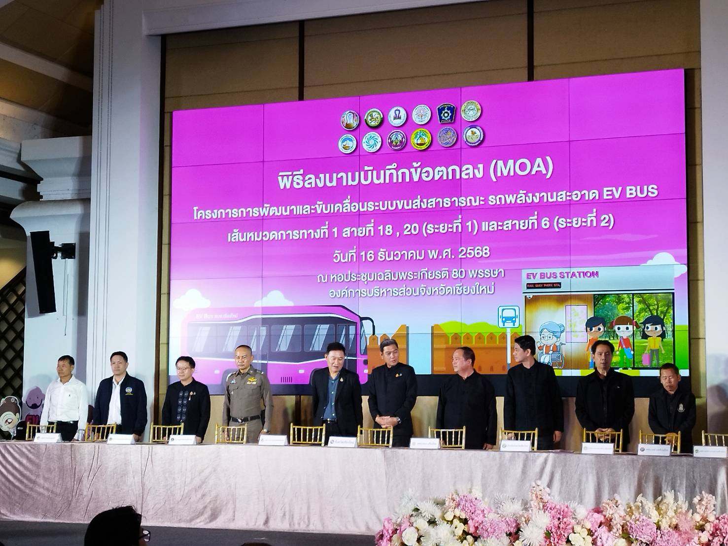 นายภาสกร เจตะบุตร ผู้อำนวยการส่วนอำนวยความปลอดภัย รักษาราชการแทน ผู้อำนวยการสำนักงานทางหลวงที่ 1 (เชียงใหม่) ร่วมลงนามบันทึกข้อตกลงความร่วมมือ (MOA) ในการพัฒนาและขับเคลื่อนระบบขนส่งสาธารณะพลังงานสะอาด (EV Bus) ซึ่งองค์การบริหารส่วนจังหวัดเชียงใหม่ร่วมกับหน่วยงานที่เกี่ยวข้อง ได้ดำเนินการจัดทำบันทึกข้อตกลงความร่วมมือ (MOA) ขึ้น ความร่วมมือดังกล่าวมีเป้าหมายเพื่อยกระดับการให้บริการขนส่งสาธารณะของจังหวัดเชียงใหม่ให้มีประสิทธิภาพ สะดวก ปลอดภัย และเป็นมิตรต่อสิ่งแวดล้อมสอดคล้องกับแนวทางการพัฒนาเมืองอัจฉริยะด้านการคมนาคม (Smart Mobility) และนับเป็นอีกหนึ่งก้าวสำคัญในการพัฒนาระบบขนส่งสาธารณะของจังหวัดเชียงใหม่ให้ทันสมัยและตอบโจทย์คุณภาพชีวิตของประชาชนในระยะยาว