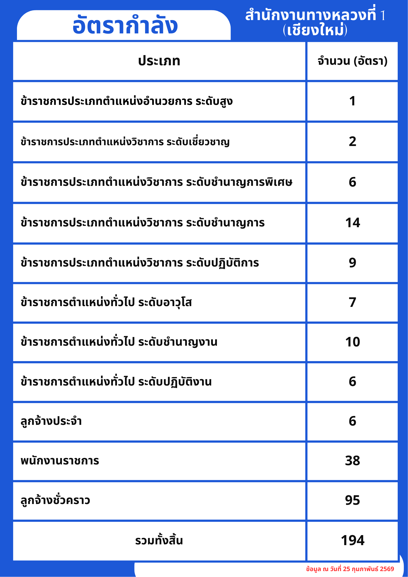 การบริหารงานและการดำเนินการของส่วนฝ่ายฝ่ายและงานต่างๆ ของสำนักงานทางหลวงที่ 1 ข้าราชการ 54 อัตรา ลูกจ้างประจำ 6 อัตรา พนักงานราชการ 38 อัตรา และลูกจ้างชั่วคราว 95 อัตราการควบคุมในการควบคุมดูแลด้านต่างๆ ในการควบคุมทั้งหมดอัตรา ที่ทำการเจ้าหน้าที่ทางหลวงที่ 1