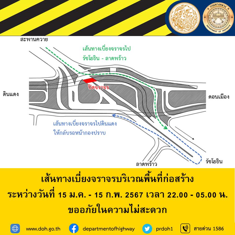 ขอแจ้งประชาสัมพันธ์ปิดจราจรบนถนนพหลโยธิน (ทล.1) บริเวณห้าแยกลาดพร้าว (ทิศทางบางซื่อ/สะพานควายมุ่งหน้ารัชโยธิน) เพื่อดำเนินการเสริมกำลังสะพาน (Strengthening)