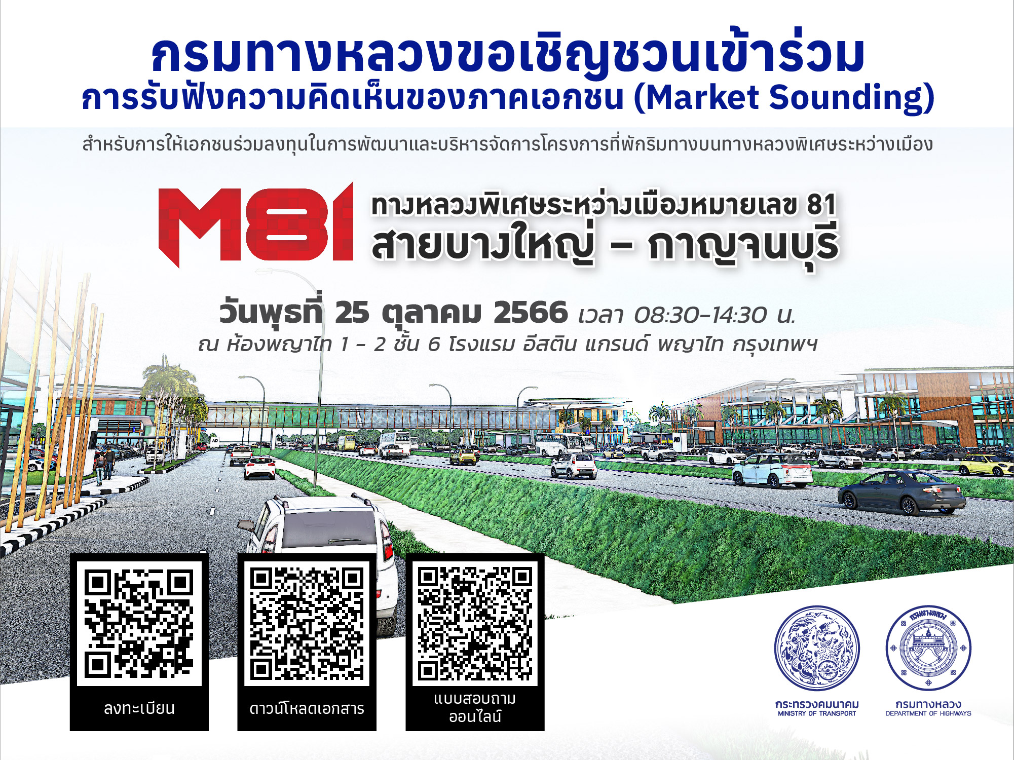กรมทางหลวงเปิดรับฟังความคิดเห็นภาคเอกชน (Market Sounding) สำหรับการให้เอกชนร่วมลงทุน ในการพัฒนาและบริหารจัดการโครงการที่พักริมทางบนทางหลวงพิเศษระหว่างเมืองหมายเลข 81 สายบางใหญ่-กาญจนบุรี