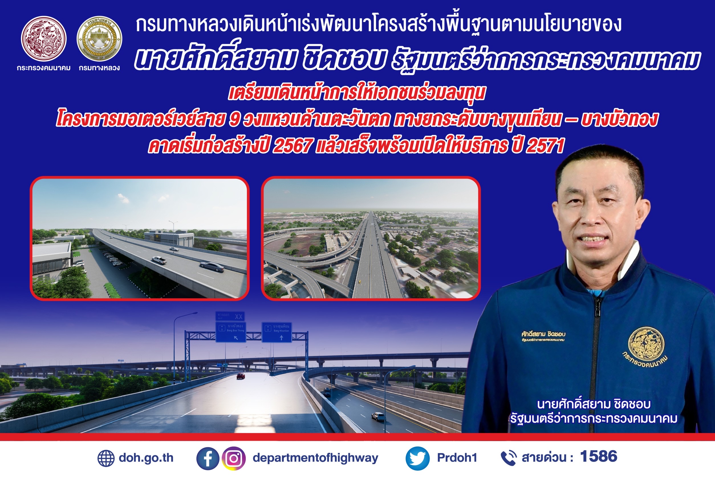 385 30/11/2565 กรมทางหลวงเตรียมเดินหน้าการให้เอกชนร่วมลงทุนโครงการมอเตอร์เวย์สาย 9 วงแหวนด้านตะวันตก ทางยกระดับบางขุนเทียน – บางบัวทอง หลังบอร์ด PPP ไฟเขียว