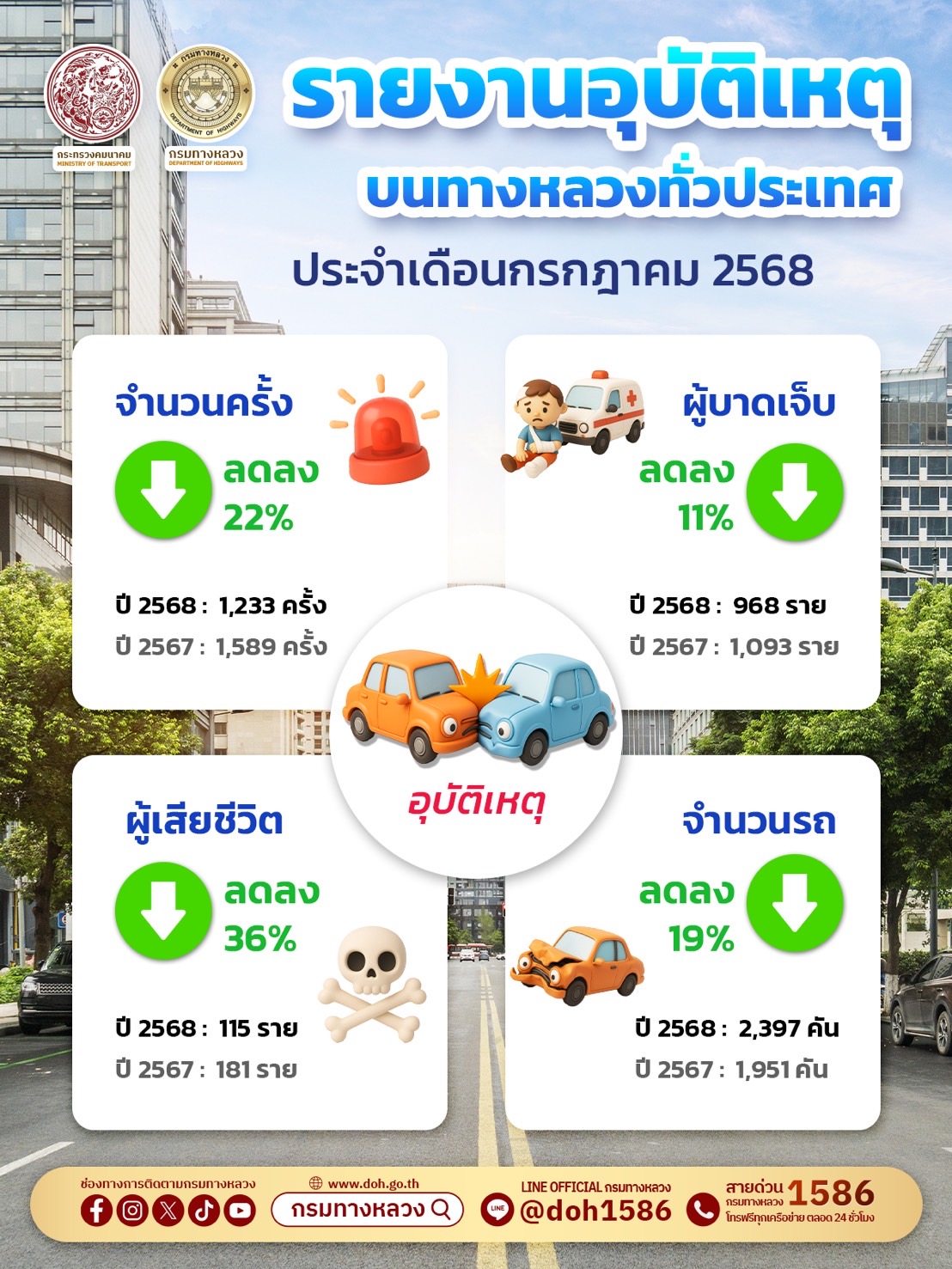 กรมทางหลวง สรุปอุบัติเหตุบนทางหลวงเดือนกรกฎาคม 2568 ลดลง 22% สาเหตุหลักขับเร็วเกินกฎหมายกำหนด
