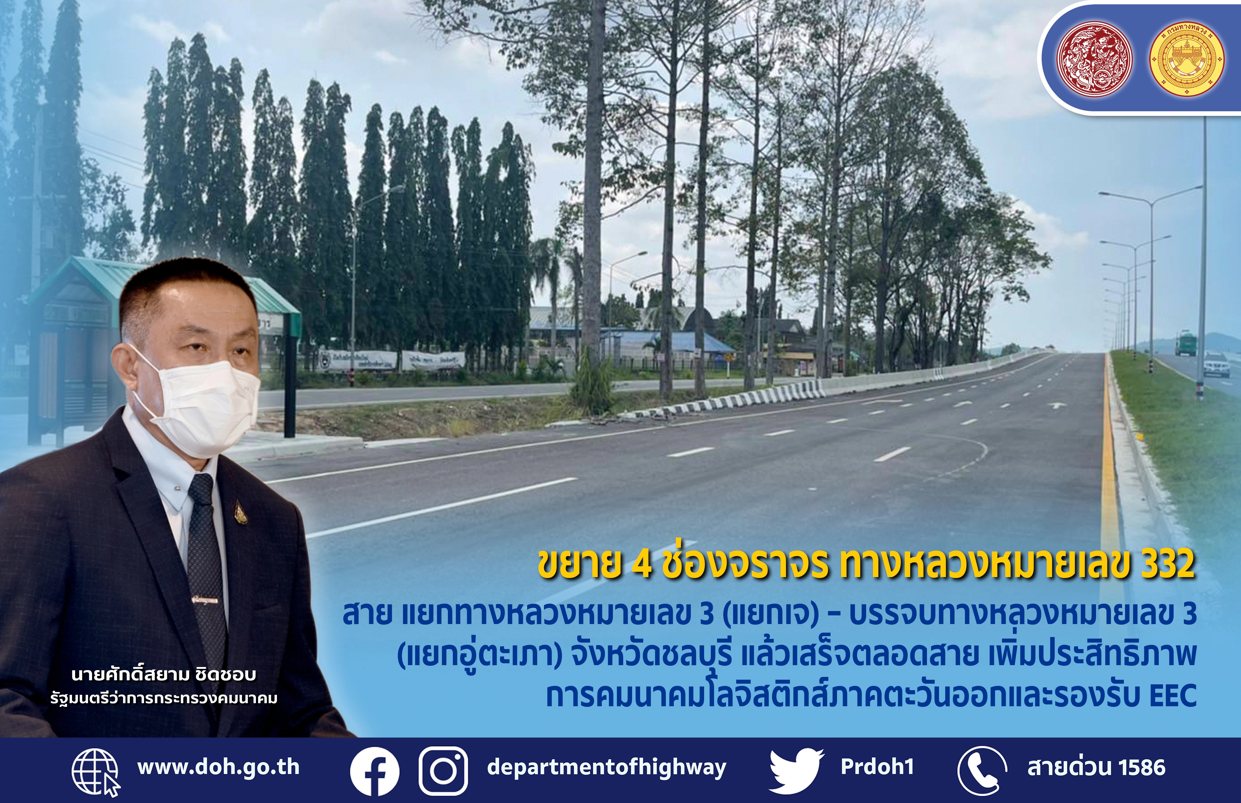 ขยาย 4 ช่องจราจร ทางหลวทงหมายเลข 332 สาย แยกทางหลวงหมายเลข 3 (แยกเจ) – บรรจบทางหลวงหมายเลข 3 (แยกอู่ตะเภา) จังหวัดชลบุรี แล้วเสร็จตลอดสาย เพิ่มประสิทธิภาพการคมนาคมโลจิสติกส์ภาคตะวันออกและรองรับEEC