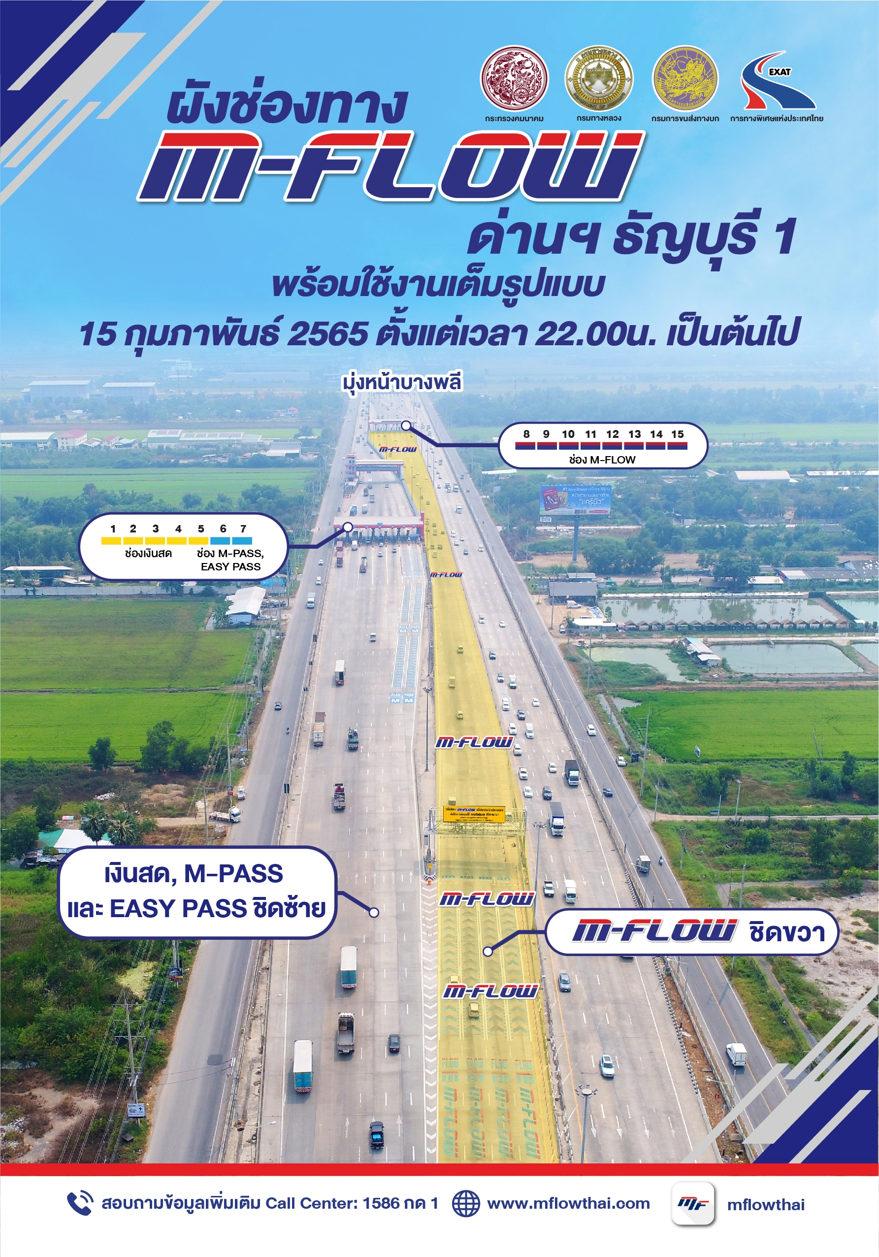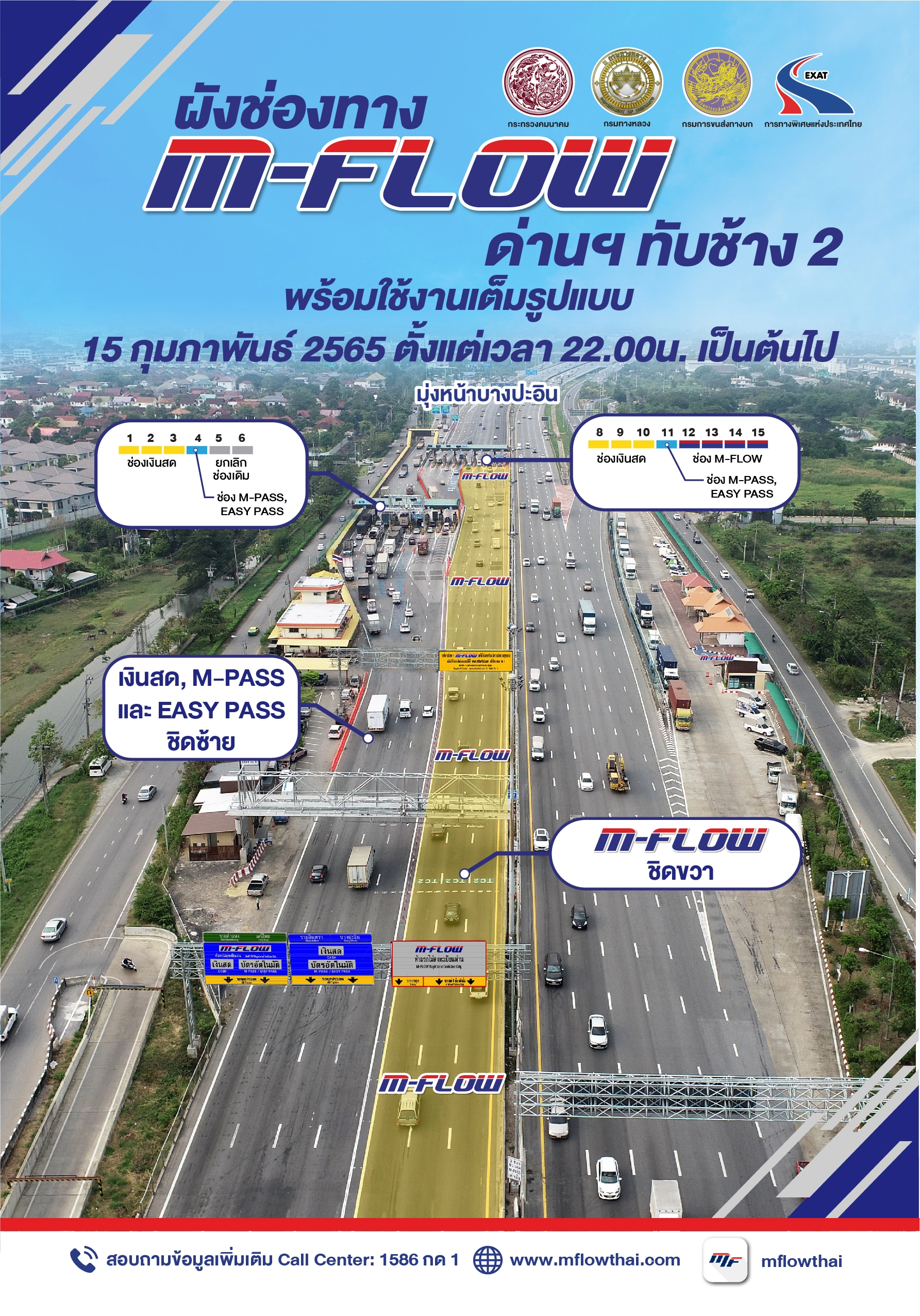M-Flow พร้อมใช้งานเต็มรูปแบบ 4 ด่านเก็บค่าธรรมเนียม ตั้งแต่วันที่ 15 กุมภาพันธ์ 2565 เวลา 22.00 น. เป็นต้นไป