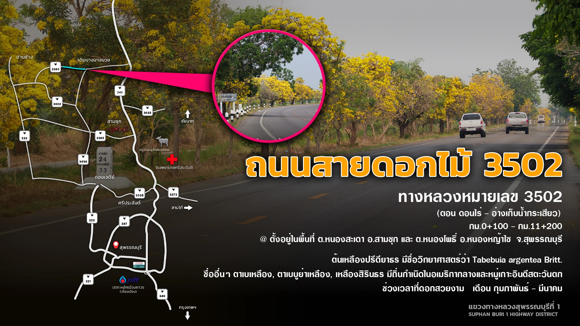 ถนนสายดอกเหลืองปรีดียาธร หรือ ตาเบบูญ่า ตั้งอยู่บนทางหลวงหมายเลข 3502 (ตอน ดอนไร่ – อ่างเก็บน้ำกระเสียว) บริเวณ กม.0+100 – กม.11+200 ระยะทางกว่า 11 กิโลเมตร ในพื้นที่ ตำบลหนองสะเดา อำเภอสามชุก และตำบลหนองโพธิ์ อำเภอหนองหญ้าไซ จังหวัดสุพรรณบุรี ขณะนี้เริ่มออกดอกบานสะพรั่งเต็มสองข้างทางแล้ว ซึ่งจะออกดอกช่วงเดือนกุมภาพันธ์ – มีนาคม ของทุกปี ทั้งนี้ขึ้นอยู่กับสภาพอากาศด้วย ตาเบบูญ่า หรือ เหลืองปรีดียาธร เป็นต้นไม้ที่ หม่อมราชวงศ์ปรีดิยาธร เทวกุล นำเข้ามาปลูกจากอินโดเซีย เป็นไม้ยืนต้น มีลักษณะเป็นรูประฆังสีเหลือง ปลายกลีบแยกเป็นรูปปากเปิด ทำให้ช่วงที่มีการออกดอกนั้น มีความน่าสนใจและดึงดูดให้กับนักท่องเที่ยวและประชาชนที่จะถ่ายภาพจำนวนมาก สำหรับการเดินทางมาท่องเที่ยวจากกรุงเทพฯ ให้ใช้ทางหลวงหมายเลข 340 มุ่งหน้าสู่จังหวัดสุพรรณบุรี เลี้ยวซ้ายที่แยกสามชุก บริเวณ กม. 103 +600 ผ่านตลาดสามชุก ไปยัง ทางหลวงหมายเลข 3365 อีก 4 กิโลเมตร เลี้ยวขวาที่แยกดอนยาว ตัดทางหลวงหมายเลข 3496 อีกประมาณ 5 กิโลเมตร เลี้ยวซ้ายเข้าสู่ ทางหลวงหมายเลข 3502 (ถนนสายดอกไม้) ประวัติความเป็นมาถนนสายดอกไม้นี้ เมื่อปี 2540 กรมทางหลวงได้ก่อสร้างถนนหมายเลข 3502 ตอนดอนไร่ - อ่างเก็บน้ำกระเสียว ซึ่งเป็นเส้นทางเชื่อมต่อระหว่าง อ.สามชุก หนองหญ้าไซ ไปสู่ อ.ด่านช้าง จ.สุพรรณบุรี ได้ปลูกต้นเหลืองปรีดียาธรทั้งสองข้างทาง ตลอดระยะเวลาที่ผ่านมา แขวงฯสุพรรณบุรีที่ 1 โดยหมวดทางหลวงด่านช้าง องค์กรปกครองส่วนท้องถิ่นในพื้นที่ ชาวบ้านในพื้นที่ได้ช่วยดูแลบำรุงรักษาจนออกดอกบานสะพรั่ง เป็นถนนสวยงามและกลายเป็นจุดที่นักท่องเที่ยวให้ความสนใจจนถึงปัจจุบัน