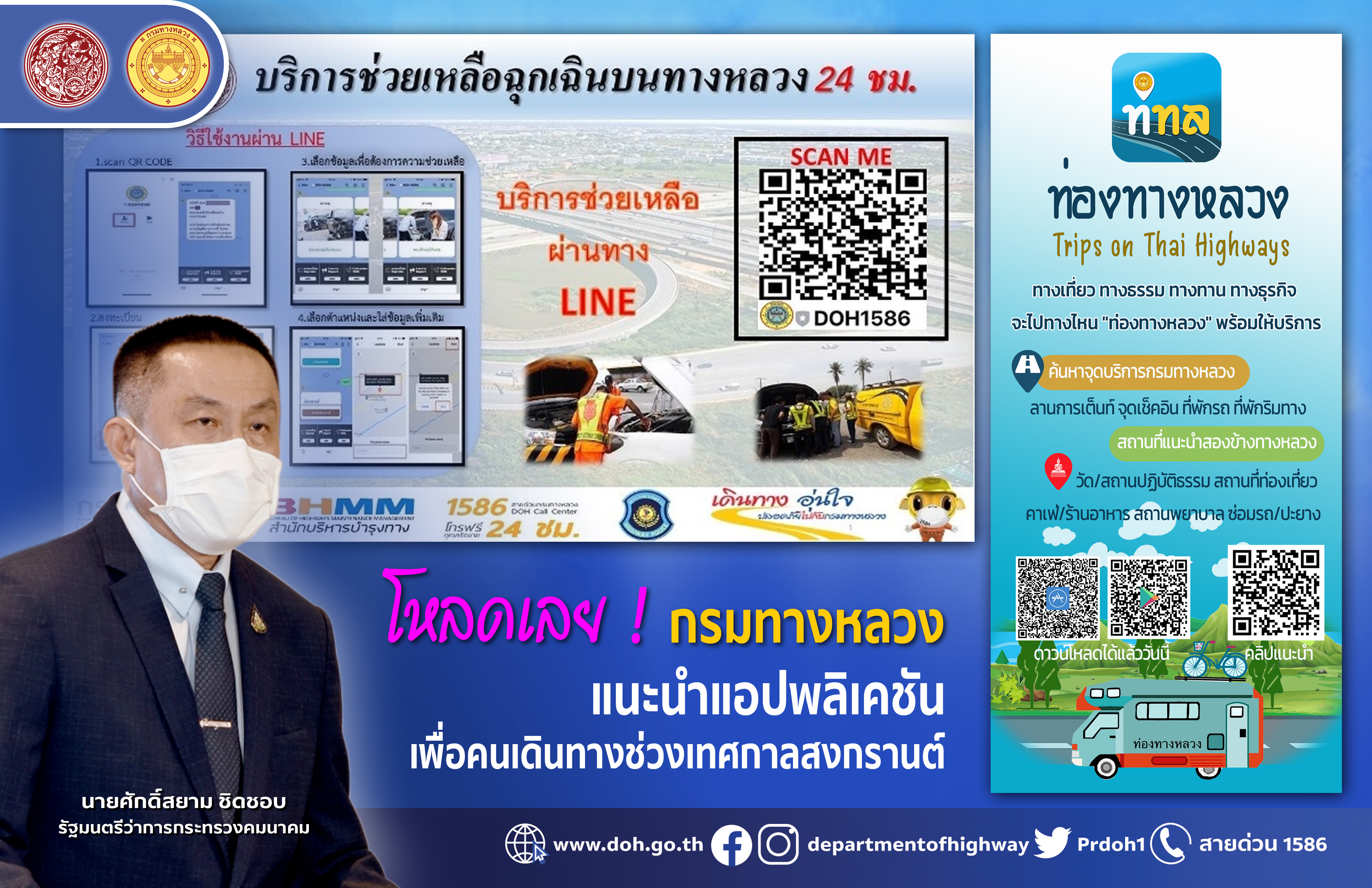 นอกจากนั้นกรมทางหลวงยังมีช่องทางการให้บริการช่วยเหลือฉุกเฉินบนทางหลวงตลอด 24 ชั่วโมง ผ่านทางแอปพลิเคชั่น LINE เพียงสแกน QR code หรือ เพิ่มเพื่อน DOH1586 ทำการลงทะเบียนแล้วเลือกข้อมูลเพื่อต้องการความช่วยเหลือ เลือกตำแหน่งและใส่ข้อมูลเพิ่มเติม ทั้งนี้ ผู้ใช้เส้นทางสามารถดาวน์โหลดแอปพลิเคชัน ทั้งระบบ IOS และ Android ได้ที่ App Store และ Google Play Store หากต้องการสอบถามรายละเอียดเพิ่มเติมได้ที่สายด่วนกรมทางหลวง 1586 (โทรฟรีทุกเครือข่ายตลอด 24 ชั่วโมง)