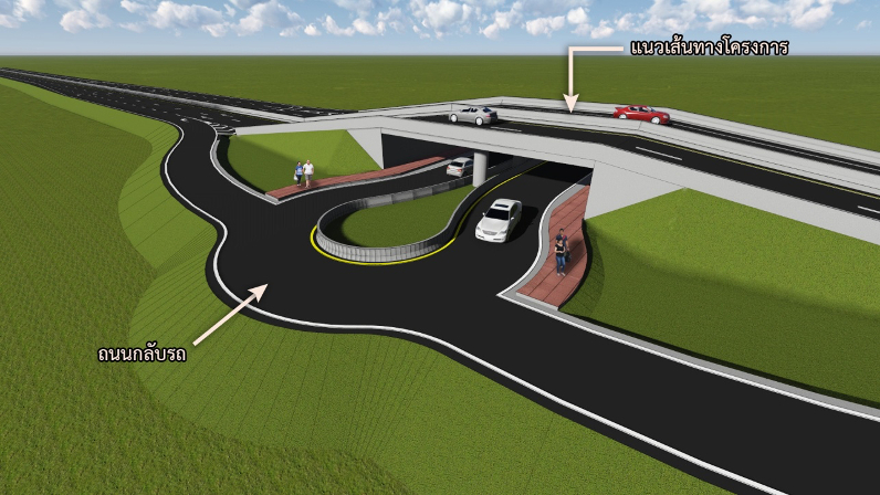 - รูปแบบที่ 2 รูปแบบจุดกลับรถใต้สะพานข้ามคลอง จำนวน 13 แห่ง โดยรูปแบบนี้จะเป็นการก่อสร้างจุดกลับรถใต้สะพานข้ามคลอง ซึ่งจะช่วยให้ประชาชนในท้องถิ่นใช้ระบบกลับรถในโครงการให้มีความปลอดภัยขึ้น