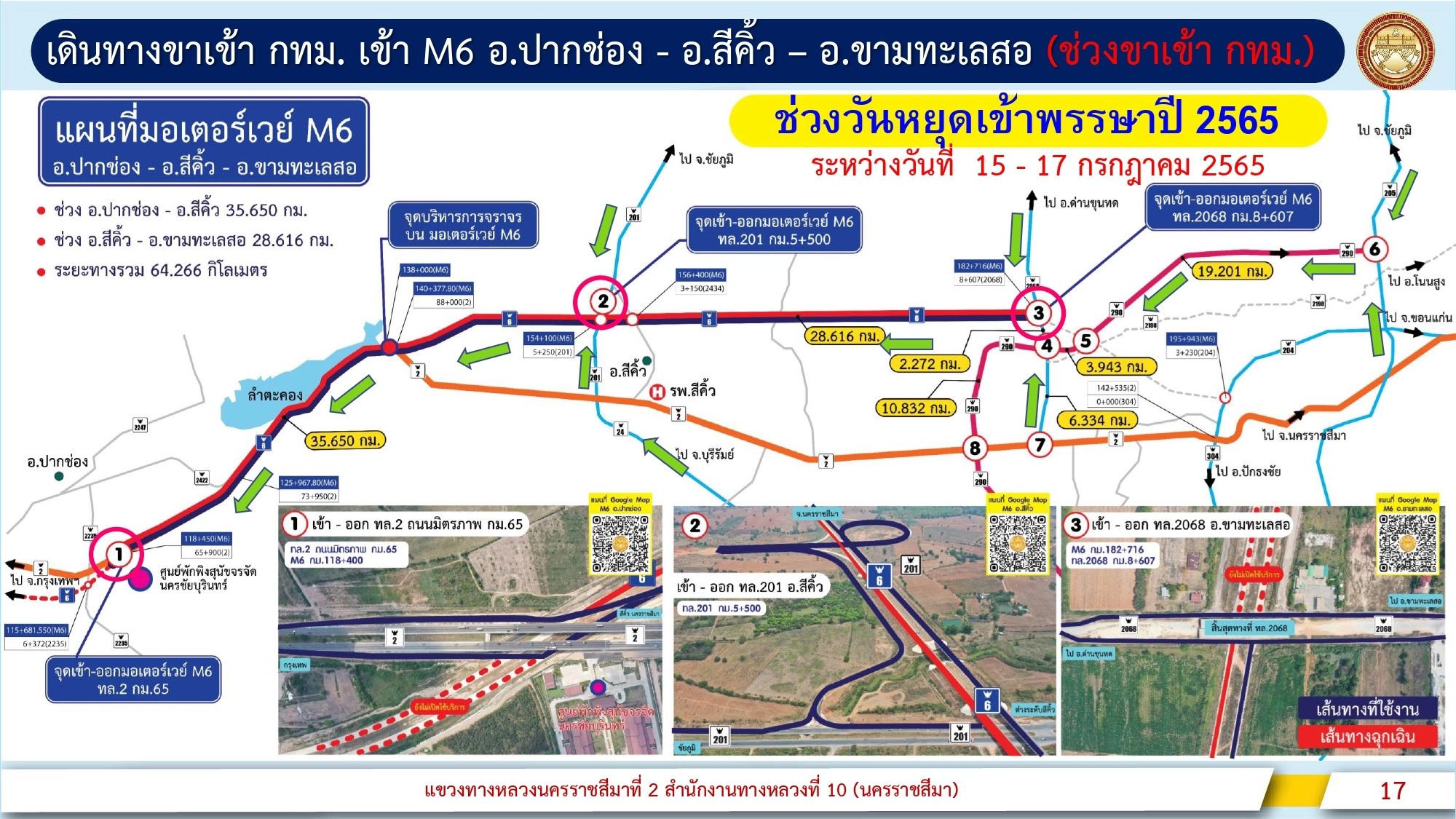 สำหรับการบริหารการจราจรมอเตอร์เวย์ M6 ช่วง ปากช่อง - สีคิ้ว - ขามทะเลสอ ช่วงขาออกวันที่ 13 – 14 กรกฎาคม 2565 และขาเข้าวันที่ 15 – 17 กรกฎาคม 2565 มีรูปแบบการให้บริการเดินรถทางเดียว โดยจะเปิดช่องจราจรด้านขวาทาง (ด้านขาเข้า) จำนวน 2 ช่องจราจรเท่านั้น สำหรับช่องจราจรด้านซ้ายทาง (ด้านขาออก) จะสงวนไว้ใช้สำหรับบริการฉุกเฉินเฉพาะเจ้าหน้าที่เท่านั้น โดยเปิดให้บริการมีจุดเข้า - ออกตามแผนที่ดังนี้
