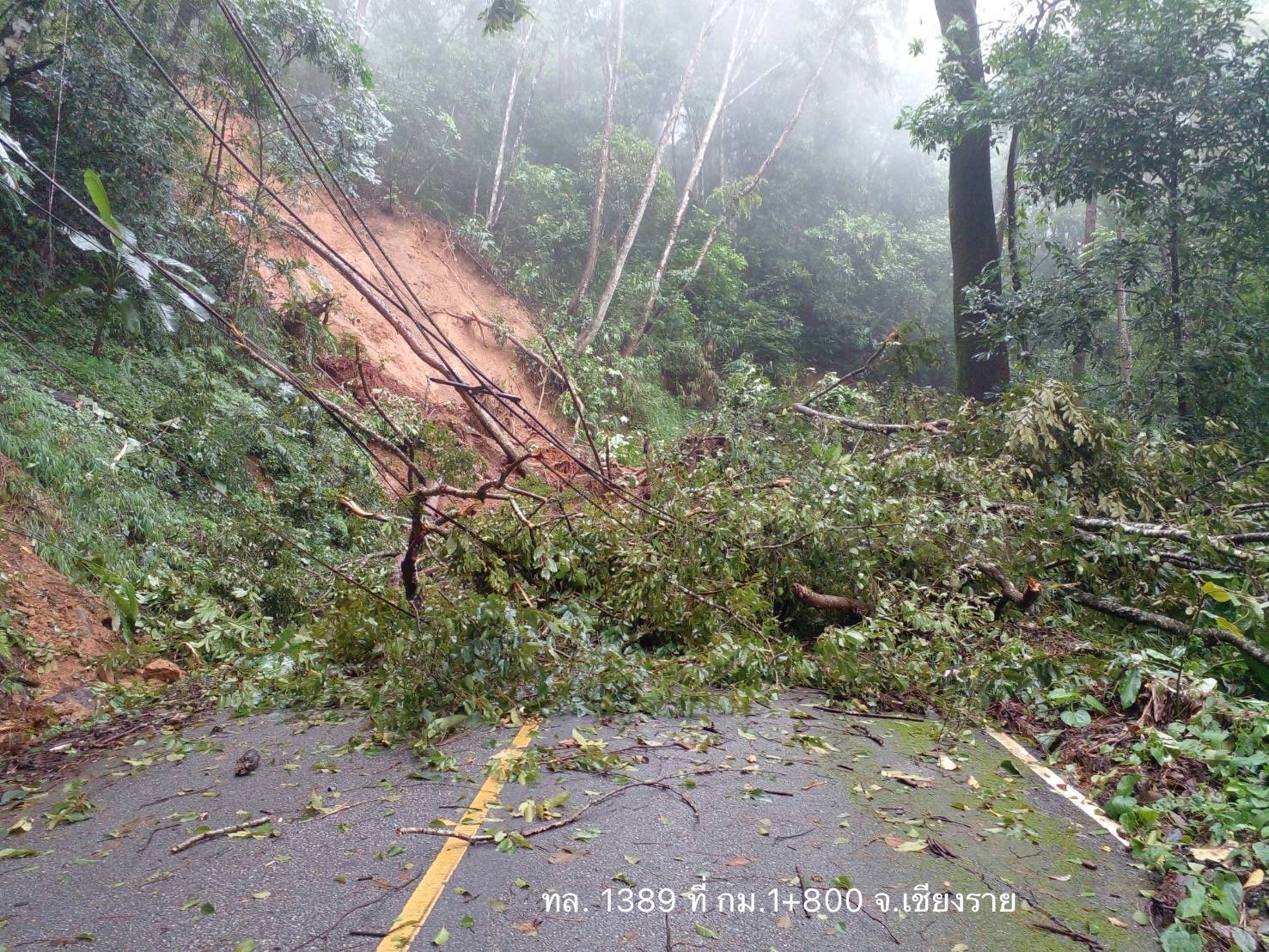 - ทางหลวงหมายเลข 1389 ตอน สถานีเพาะพันธุ์สัตว์ป่าดอยตุง - วัดพระธาตุดอยตุง พื้นที่อำเภอแม่สาย ช่วงกม.ที่ 1+800 ด้านซ้ายทาง ดินสไลด์ปิดทับเส้นทางจราจร 2 ช่องจราจร และเสาไฟฟ้าล้มทับเส้นทางจราจร ปัจจุบันอยู่ระหว่างการเคลื่อนย้ายวัสดุ และกรมทางหลวงได้จัดเจ้าหน้าที่คอยอำนวยความสะดวก แนะนำเส้นทางเลี่ยง ใช้ทางหลวงหมายเลข 1149