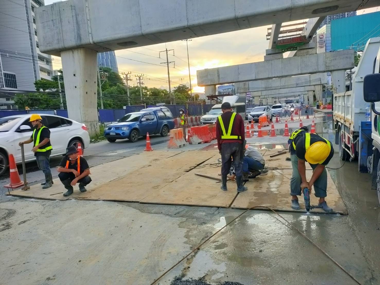 2. ดำเนินการแก้ไขเพื่อคืนพื้นผิวจราจรให้สามารถเปิดการสัญจรชั่วคราวโดยการรื้อสกัดผิวถนนที่ทรุดตัว หาโพรงที่มีการรั่วซึมและนำทรายหยาบลง พร้อมเทคอนกรีต high strength fast setting แล้วปูแผ่นเหล็กทับชั่วคราว ซึ่งคาดว่าจะแล้วเสร็จและเปิดการจราจรตามปกติได้ในเวลาประมาณ 18.30 น. ของวันนี้ (11 กันยายน 2565) เพื่ออำนวยความสะดวกในการเดินทางให้กับประชาชน