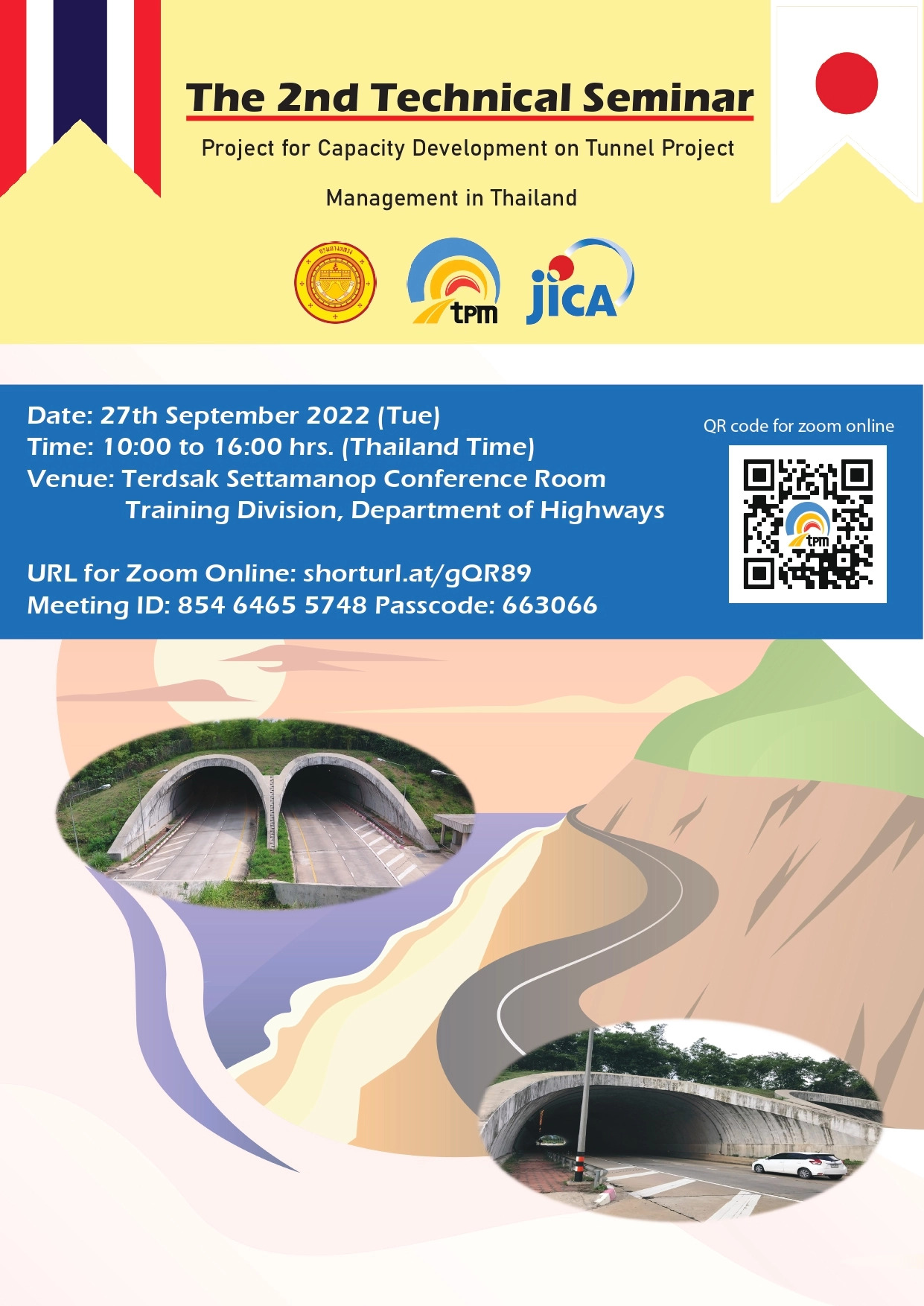 จัดสัมมนาทางวิชาการ ครั้งที่ 2 เพื่อนำเสนอภาพรวมความก้าวหน้าของโครงการพัฒนาสมรรถนะการบริหารงานโครงการอุโมงค์ในประเทศไทย (Project for Capacity Development on Tunnel Project Management in Thailand) ระยะเวลาโครงการประมาณ 4 ปี (เริ่มต้นในปี พ.ศ. 2564) รวมถึงการบรรยายพิเศษที่เกี่ยวกับการดำเนินงานโครงการอุโมงค์ ในวันอังคารที่ 27 กันยายน 2565 เวลา 10.00-16.00 น. ณ ห้องสัมมนาเทิดศักดิ์ เศรษฐมานพ ชั้น 3 กองฝึกอบรม กรมทางหลวง และการสัมมนาผ่านสื่อออนไลน์ แอพพลิเคชั่น ZOOM