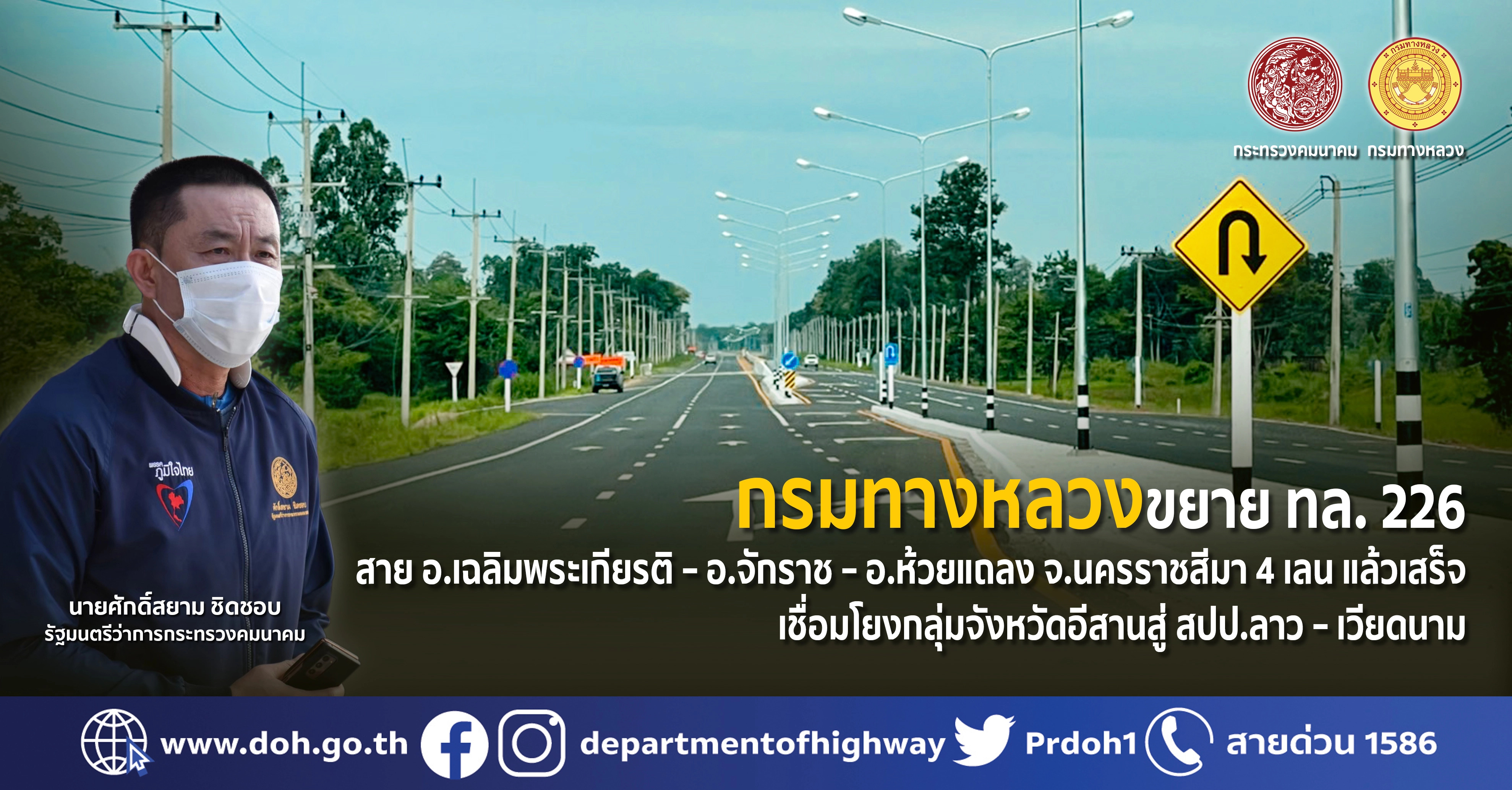 นายสราวุธ ทรงศิวิไล อธิบดีกรมทางหลวง เปิดเผยว่า กรมทางหลวงได้ดำเนินโครงการก่อสร้างขยายทางหลวงหมายเลข 226 สาย อ.เฉลิมพระเกียรติ – อ.จักราช – อ.ห้วยแถลง จ.นครราชสีมา จากขนาด 2 ช่องจราจร เป็นขนาด 4 ช่องจราจร แล้วเสร็จ ระยะทางประมาณ 21.660 กิโลเมตร ตามนโยบายของนายศักด์สยาม ชิดชอบ รัฐมนตรีว่าการกระทรวงคมนาคม ที่ต้องการบูรณาการด้านคมนาคมและระบบโลจิสติกส์ รองรับเชื่อมโยงกลุ่มจังหวัดภาคตะวันออกเฉียงเหนือ กับ สปป.ลาว ต่อเนื่องไปยังประเทศเวียดนาม สนับสนุนส่งเสริมการค้า การลงทุน และเพิ่มศักยภาพการแข่งขันของประเทศ อีกทั้งเพื่อแก้ไขปัญหาจราจร ลดอุบัติเหตุ และลดต้นทุนในการขนส่งสินค้า เพิ่มความสามารถในการแข่งขันด้านการค้า
