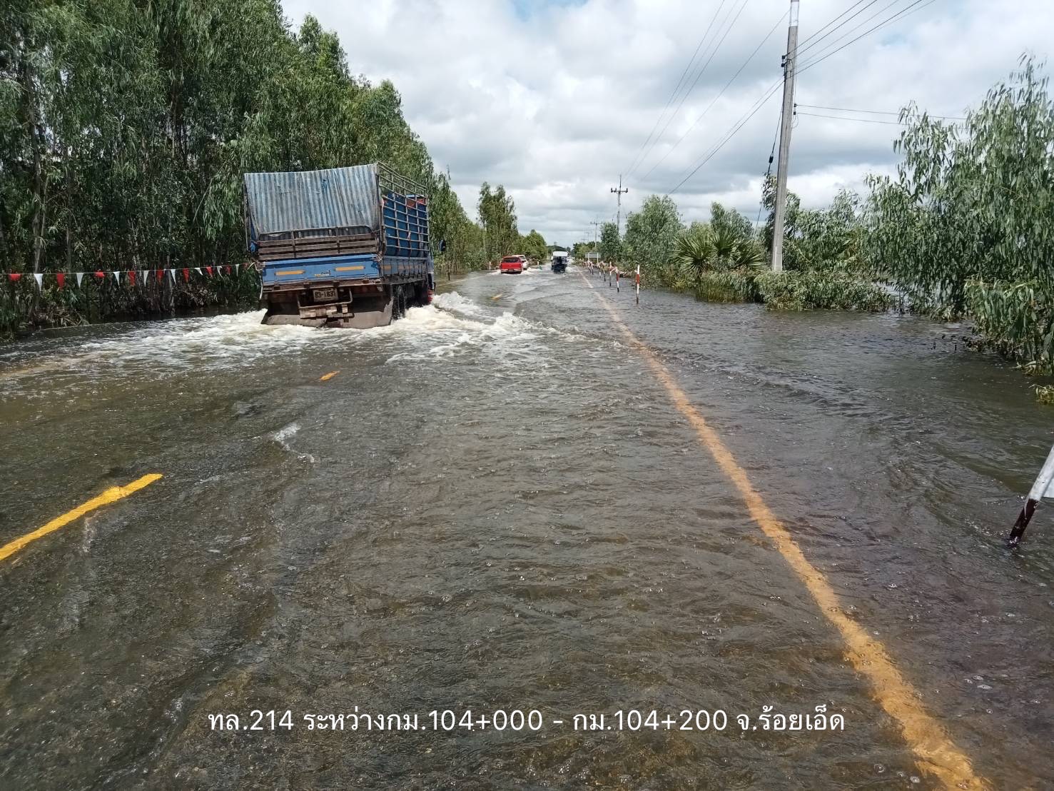 - ทางหลวงหมายเลข 226 ตอน ห้วยขะยุง – วารินชำราบ ในพื้นที่ อ.วารินชำราบ ช่วง กม.ที่ 319+600 – 320+200 ระดับน้ำ 120 ซม.