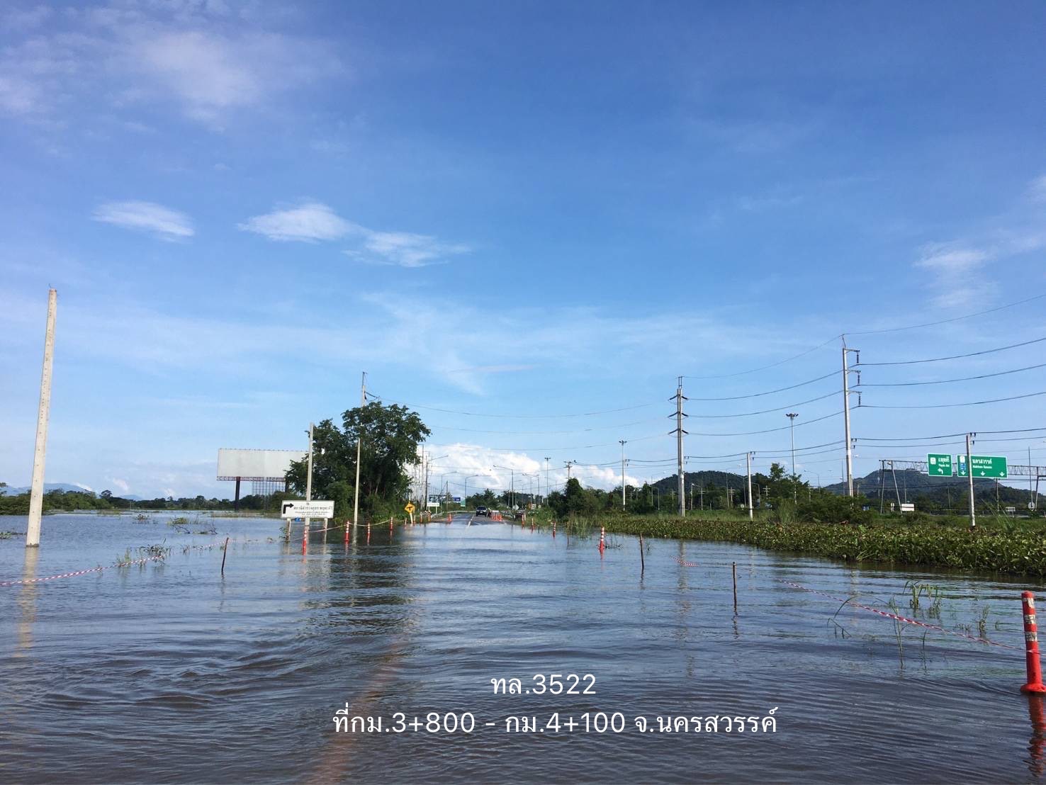 - ทางหลวงหมายเลข 3522 เนินฝอยทอง – ทุ่งผักเบี้ย ในพื้นที่ อ.พยุหะคีรี ช่วง กม.ที่ 3+800 – 4+100 ระดับน้ำ 40 – 50 ซม. การจราจรไม่สามารถผ่านได้