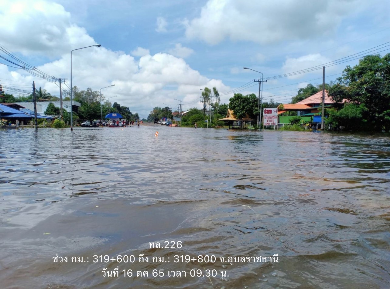 - ทางหลวงหมายเลข 226 ตอน ห้วยขะยุง – วารินชำราบ ในพื้นที่ อ.วารินชำราบ ช่วง กม.ที่ 319+600 – 319+800 ระดับน้ำ 135 - 140 ซม. ใช้ทางเลี่ยง ทล.2178