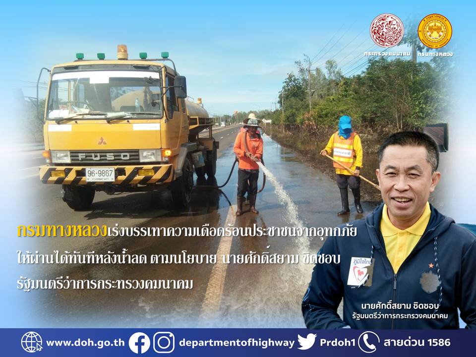 นายสราวุธ ทรงศิวิไล อธิบดีกรมทางหลวง เปิดเผยว่า จากสถานการณ์น้ำท่วมบนทางหลวงในหลายจังหวัด ส่งผลกระทบให้ประชาชนในพื้นที่และรอบๆ ได้รับความเดือดร้อน นายศักดิ์สยาม ชิดชอบ รัฐมนตรีว่าการกระทรวงคมนาคม ให้ความสำคัญในการช่วยเหลือผู้ประสบอุทกภัย พร้อมแสดงความห่วงใยและส่งกำลังใจถึงประชาชนในพื้นที่ให้สามารถผ่านวิกฤตการณ์ดังกล่าวไปได้โดยเร็ว จึงสั่งการให้กรมทางหลวงเร่งแก้ปัญหาความเดือดร้อนของประชาชน เพื่ออำนวยความสะดวกและปลอดภัย โดยได้เร่งซ่อมแซมและทำความสะอาดเส้นทางที่ได้รับผลกระทบให้สามารถสัญจรได้โดยเร็ว