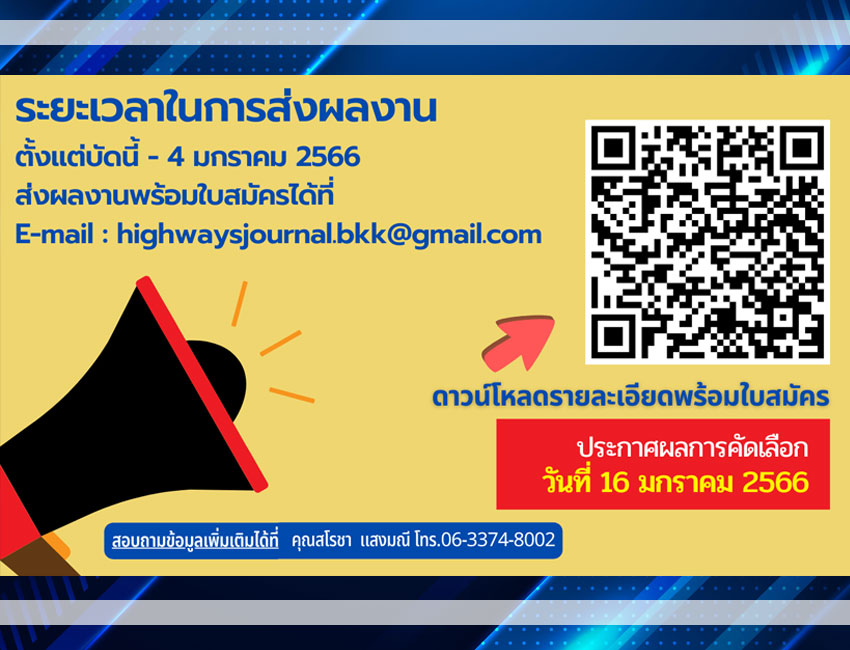 สมาคมสโมสรกรมทางหลวง จัดกิจกรรมโครงการประกวดออกแบบตราสัญลักษณ์ (logo) วารสารทางหลวง โดยขอเชิญชวนหน่วยงานและบุคคลที่สนใจส่งผลงานเข้าร่วมประกวดออกแบบตราสัญลักษณ์ ตั้งแต่บัดนี้เป็นต้นไป จนถึง วันที่ 4 มกราคม 2566 สามารถส่งผลงานได้ที่ E-mail : highwaysjournal.bkk@gmail.com