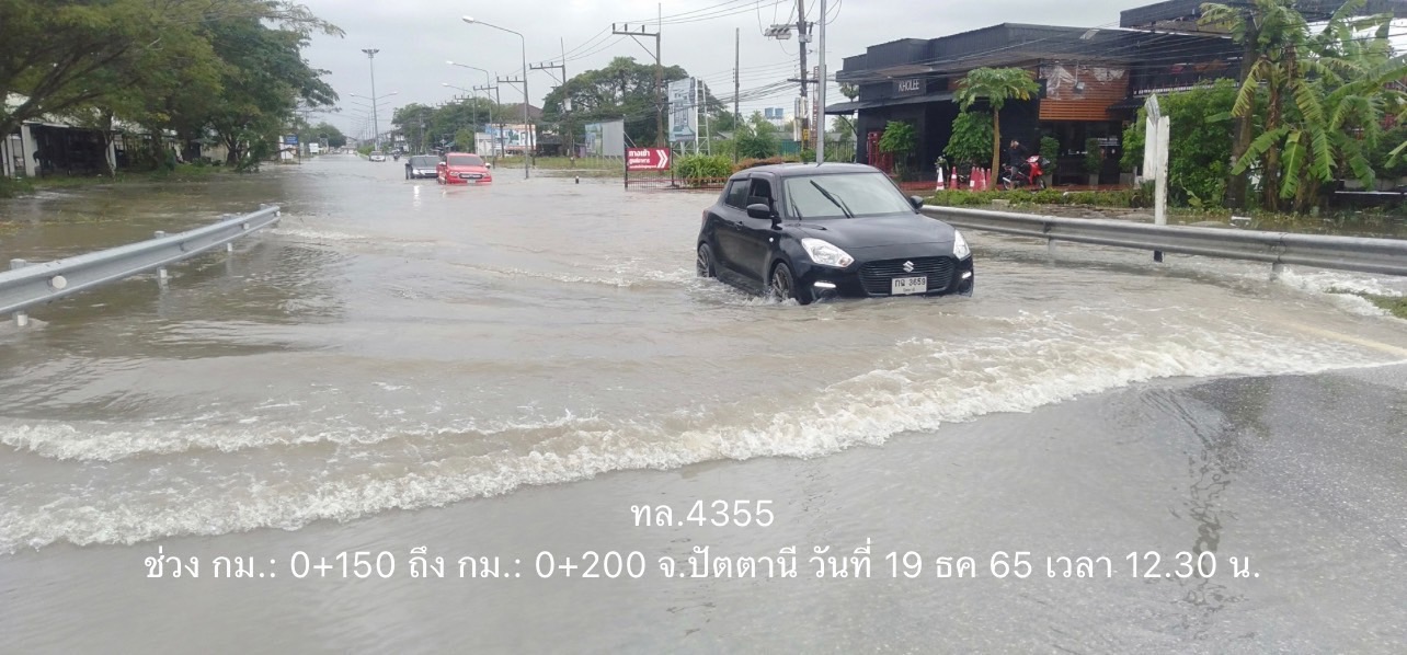 - ทางหลวงหมายเลข 4055 ตอน มะนังตายอ – จือมอ อ.ระแงะ ช่วง กม.25+200 – 25+300 ระดับน้ำ 50 ซม. ใช้เส้นทางเลี่ยงท้องถิ่นแทน