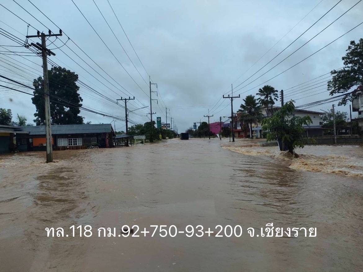 4. ทางหลวงหมายเลข 118 อ.เวียงป่าเป่า สายดอยนางแก้ว - แม่สรวย กม.ที่ 92+750 – 93+200 ระดับน้ำ 40 ซม. การจราจรผ่านไม่ได้ ไม่มีเส้นทางเลี่ยง