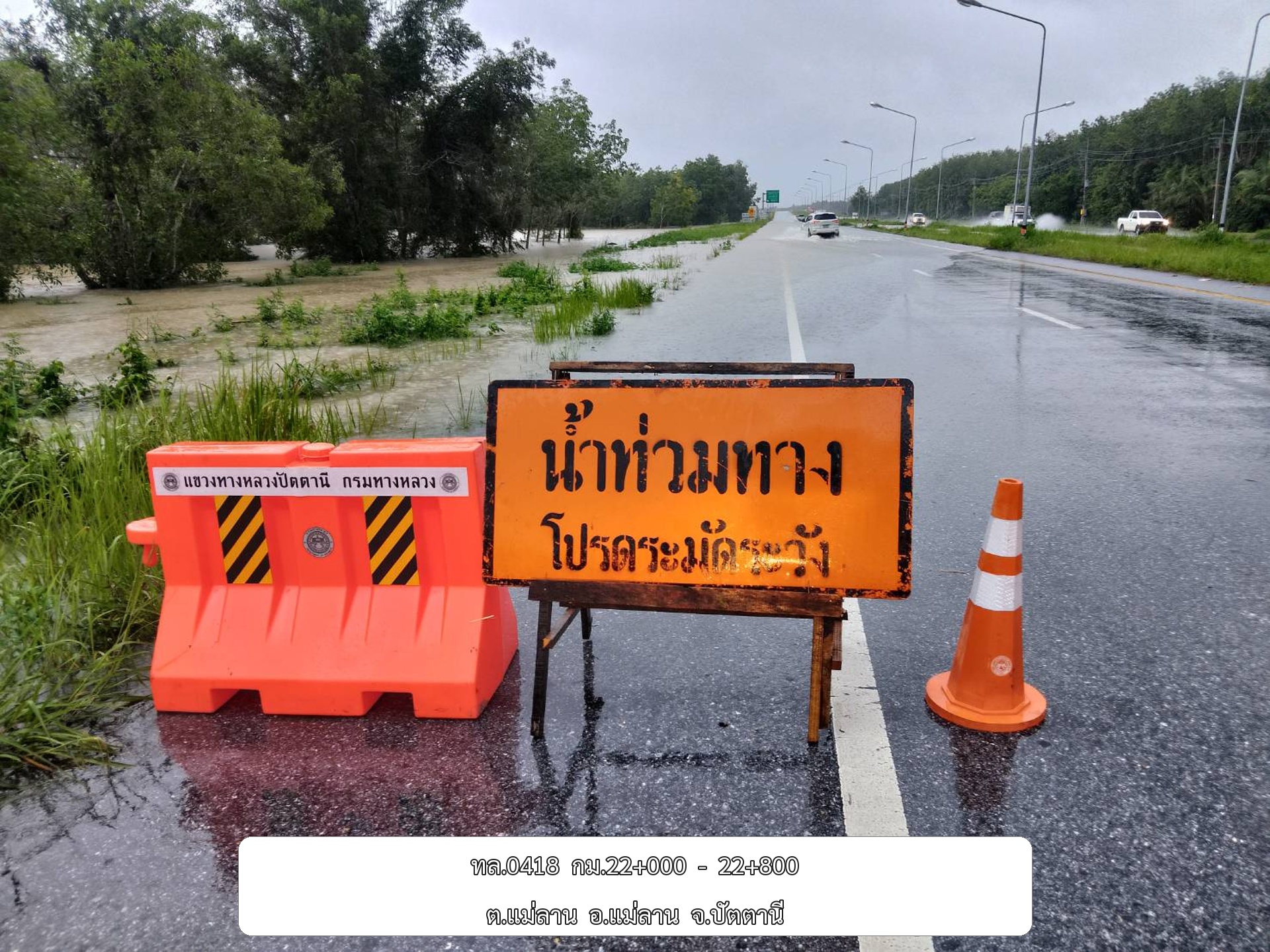 •ทล.42 นาจวก – ดอนยาง ช่วง กม.ที่ 76+000 - 76+500 อ.โคกโพธิ์ จ.ปัตตานี ระดับน้ำ 20 ซม.