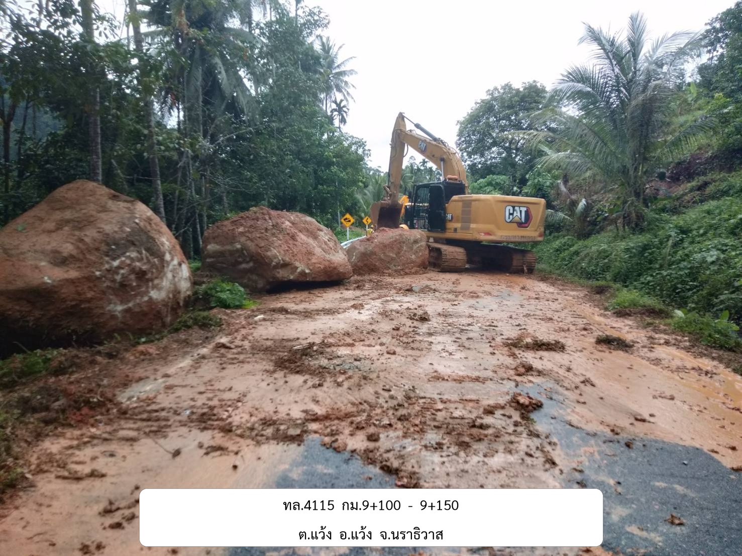 1. ทล.4115 ทางเลี่ยงเมืองกรือซอ ช่วง กม.ที่ 9+100 – 9+150 อ.แว้ง ดินโคลนถล่มทับผิวทาง