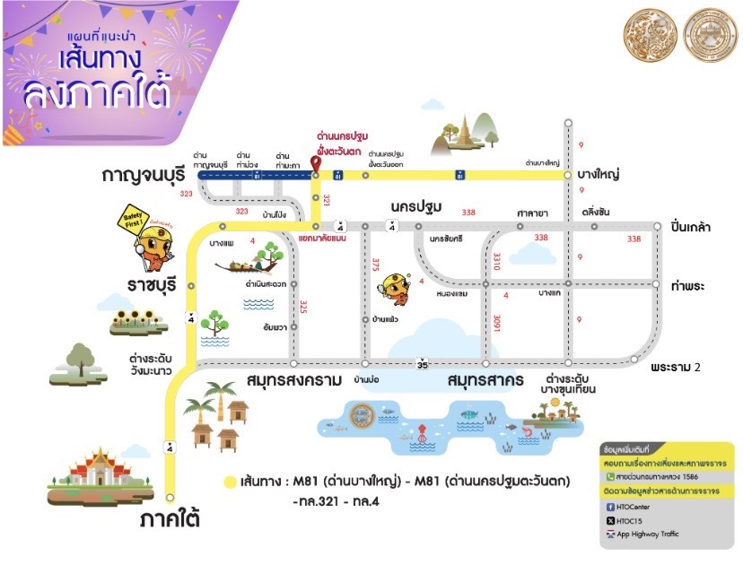 กรมทางหลวง โดยสำนักอำนวยความปลอดภัย แจ้งว่า ตามที่กรมทางหลวงจะเปิดให้บริการชั่วคราวทางหลวงพิเศษระหว่างเมืองหมายเลข 81 (มอเตอร์เวย์) สายบางใหญ่ – กาญจนบุรี ตลอดเส้นทางระยะทาง 96 กิโลเมตร เฉพาะช่วงเทศกาลปีใหม่ตั้งแต่วันที่ 27 ธ.ค. 67 เวลา 00.01 น. ถึง วันที่ 2 ม.ค. 68 เวลา 24.00 น. นั้น โดยผู้ใช้ทางที่มาจากกรุงเทพฯฝั่งเหนือและต้องการเดินทางสู่ภาคใต้ ขอประชาสัมพันธ์แนะนำให้ใช้มอเตอร์เวย์ M81 โดยเข้าจากด่านบางใหญ่ (ตรงข้ามเซ็นทรัล เวสต์เกต) จากนั้นเลี้ยวซ้ายออกที่ด่านนครปฐมฝั่งตะวันตกเข้าสู่ทางหลวงหมายเลข 321 (ถนนมาลัยแมน) ผ่านแยกมาลัยแมนเพื่อเข้าสู่ทางหลวงหมายเลข 4 (ถนนเพชรเกษม) มุ่งหน้าจังหวัดราชบุรี สำหรับเดินทางสู่ภาคใต้ต่อไป ซึ่งจะเป็นการหลีกเลี่ยงการจราจรติดขัดเพิ่มความสะดวกในการเดินทางช่วงเทศกาลได้เป็นอย่างดี