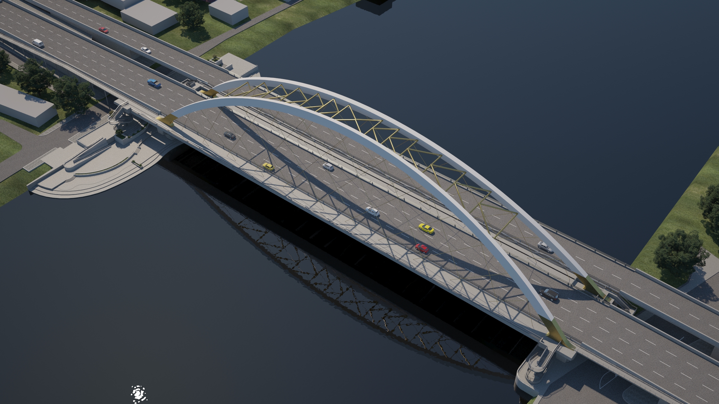 - ก่อสร้างสะพานหลัก เป็นสะพานโค้งแบบเครือข่ายที่มีระบบค้ำยันภายใน (Network Tied Arch Bridge) แห่งแรกในประเทศไทย ซึ่งมีความโดดเด่นทางวิศวกรรมด้วยช่วงยาว 150 เมตร ข้ามแม่น้ำเจ้าพระยาโดยไม่มีเสาตอม่อในน้ำ ทำให้ดูสวยงามและไม่กีดขวางการไหลของน้ำ โดยสะพานนี้ใช้เทคโนโลยี "Network Tied Arch" ที่ทันสมัย ด้วยการใช้สายเคเบิลลายเส้นขึงไขว้กันเป็นรูปแบบเครือข่าย (network cable pattern) ทำให้สะพานสามารถรับน้ำหนักได้มาก เพิ่มความแข็งแรง ลดการโก่งตัวของโครงสร้าง แตกต่างจากสะพานโค้งทั่วไปที่ใช้สายเคเบิลขึงตรง อีกทั้ง ส่วนโค้งและสายเคเบิลยังทำงานร่วมกันเพื่อช่วยถ่ายแรงไปยังพื้นสะพาน ทำให้สะพานมีความมั่นคงและปลอดภัยมากยิ่งขึ้น ผิวจราจรแบบแอสฟัลต์คอนกรีต ขนาด 3 ช่องจราจร (ขาเข้าตัวเมือง) ขนาดความกว้าง 3.50 เมตร ไหล่ทาง 2.50 เมตร พร้อมทางเท้าข้างละ 4.95 เมตร มีความสูงประมาณ 30 เมตร พร้อมงานประดับตกแต่งไฟบนสะพานเพื่อความสวยงามในยามค่ำคืน