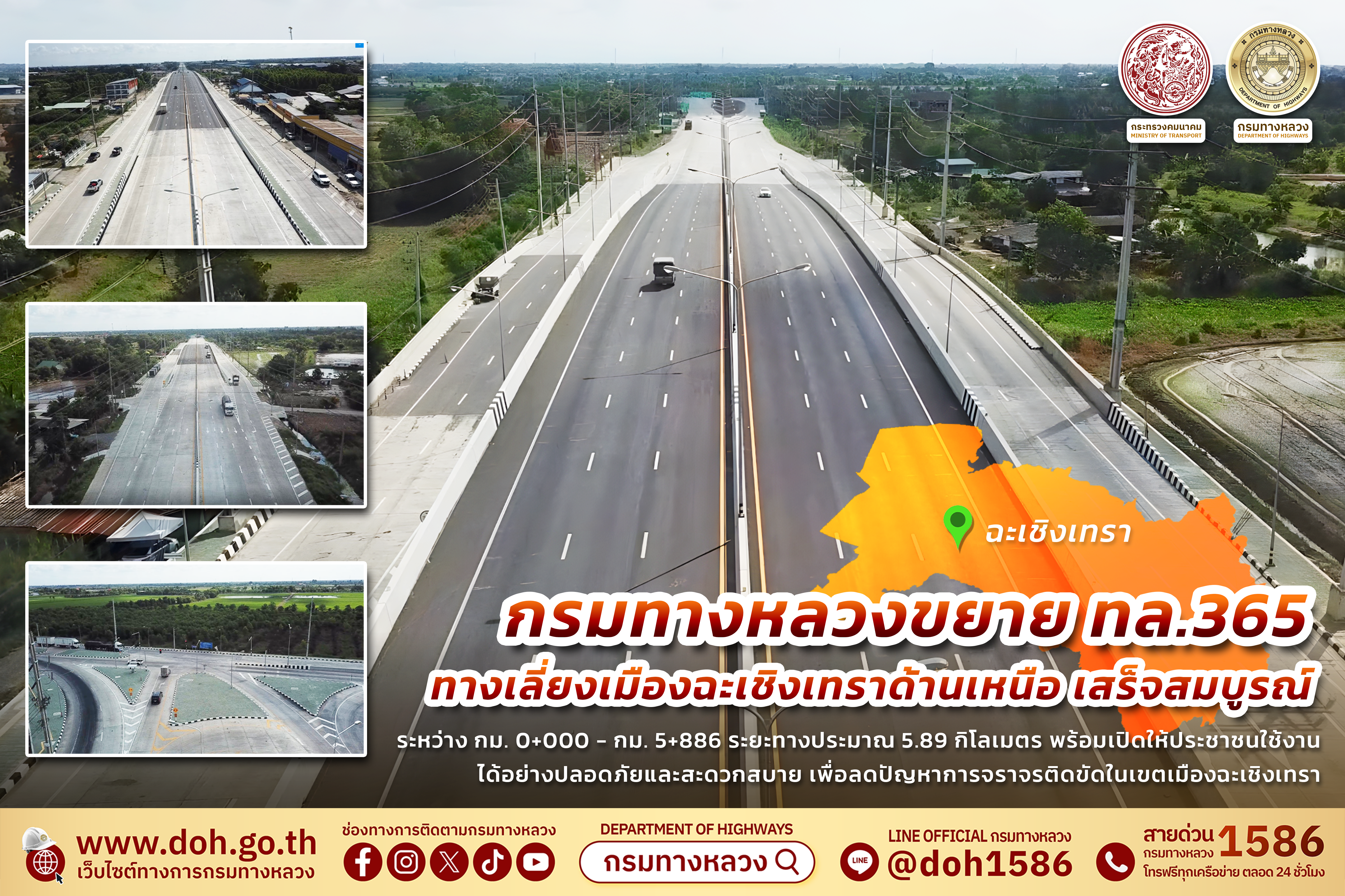 กรมทางหลวงก่อสร้างขยายทางหลวงหมายเลข 365 สาย ทางเลี่ยงเมืองฉะเชิงเทราด้านเหนือ แล้วเสร็จ ช่วยลดปัญหารถติดใจกลางเมือง เดินทางสะดวก ปลอดภัย เชื่อมต่อการเดินทางอย่างมีประสิทธิภาพ