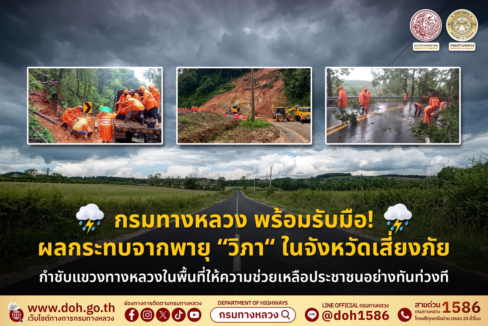 นายอภิรัฐ ไชยวงศ์น้อย อธิบดีกรมทางหลวง เปิดเผยว่า ตามที่กรมอุตุนิยมวิทยา ประกาศฉบับที่ 14 เรื่อง พายุวิภา ซึ่งคาดว่าฝนตกหนักถึงหนักมากบริเวณประเทศไทย นั้น จึงได้กำชับให้ทุกแขวงทางหลวงในพื้นที่ที่คาดว่าจะได้รับผลกระทบจากพายุ “วิภา” เร่งเตรียมความพร้อมทั้งด้านบุคลากร เครื่องจักรกล และอุปกรณ์อำนวยความปลอดภัย เพื่อให้การช่วยเหลือประชาชนเป็นไปอย่างทันท่วงทีและมีประสิทธิภาพ พร้อมทั้งให้ทุกหน่วยงานในพื้นที่เสี่ยง ทั้งภาคเหนือ ภาคตะวันออกเฉียงเหนือ และภาคกลาง ประสานการทำงานกับหน่วยงานท้องถิ่นและกรมป้องกันและบรรเทาสาธารณภัย ในการเฝ้าระวังสถานการณ์อย่างใกล้ชิด พร้อมแจ้งเตือนประชาชนและผู้ใช้ทางอย่างต่อเนื่อง? ทั้งนี้ กรมทางหลวงได้จัดเตรียมป้ายเตือนอันตราย ป้ายแนะนำเส้นทางเลี่ยง-ทางลัด และเจ้าหน้าที่ประจำจุดเสี่ยงตลอด 24 ชั่วโมง โดยเฉพาะทางหลวงสายหลักและเส้นทางภูเขาที่มีความเสี่ยงดินโคลนถล่ม เช่น จังหวัดน่าน จังหวัดพะเยา จังหวัดเชียงราย จังหวัดแพร่ และจังหวัดลำปาง เป็นต้น นอกจากนี้ ยังได้มีการเฝ้าระวังจุดเสี่ยงน้ำท่วมขังในพื้นที่ลุ่มต่ำและทางหลวงสายสำคัญ หากพบคอสะพานชำรุดได้จัดเตรียมเครื่องจักร อาทิ รถแบคโฮ รถบรรทุก และเครื่องสูบน้ำ เพื่อแก้ไขสถานการณ์ได้ทันท่วงที