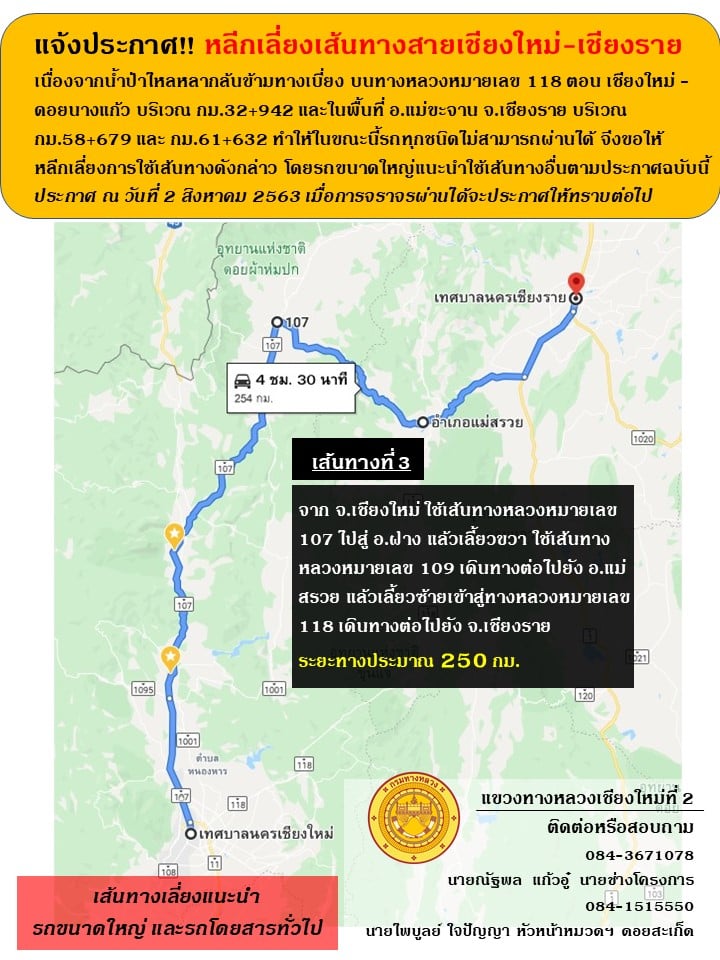 เนื่องจากน้ำป่าไหลหลากล้นข้ามทางเบี่ยง บนทางหลวงหมายเลข 118 ตอน เชียงใหม่ - ดอยนางแก้ว บริเวณ กม.32+942 และในพื้นที่ อ.แม่ขะจาน จ.เชียงราย บริเวณ กม.58+679 และ กม.61+632 ทำให้ในขณะนี้รถทุกชนิดไม่สามารถผ่านได้ จึงขอให้หลีกเลี่ยงการใช้เส้นทางดังกล่าว โดยรถขนาดใหญ่แนะนำใช้เส้นทางอื่นตามประกาศฉบับนี้