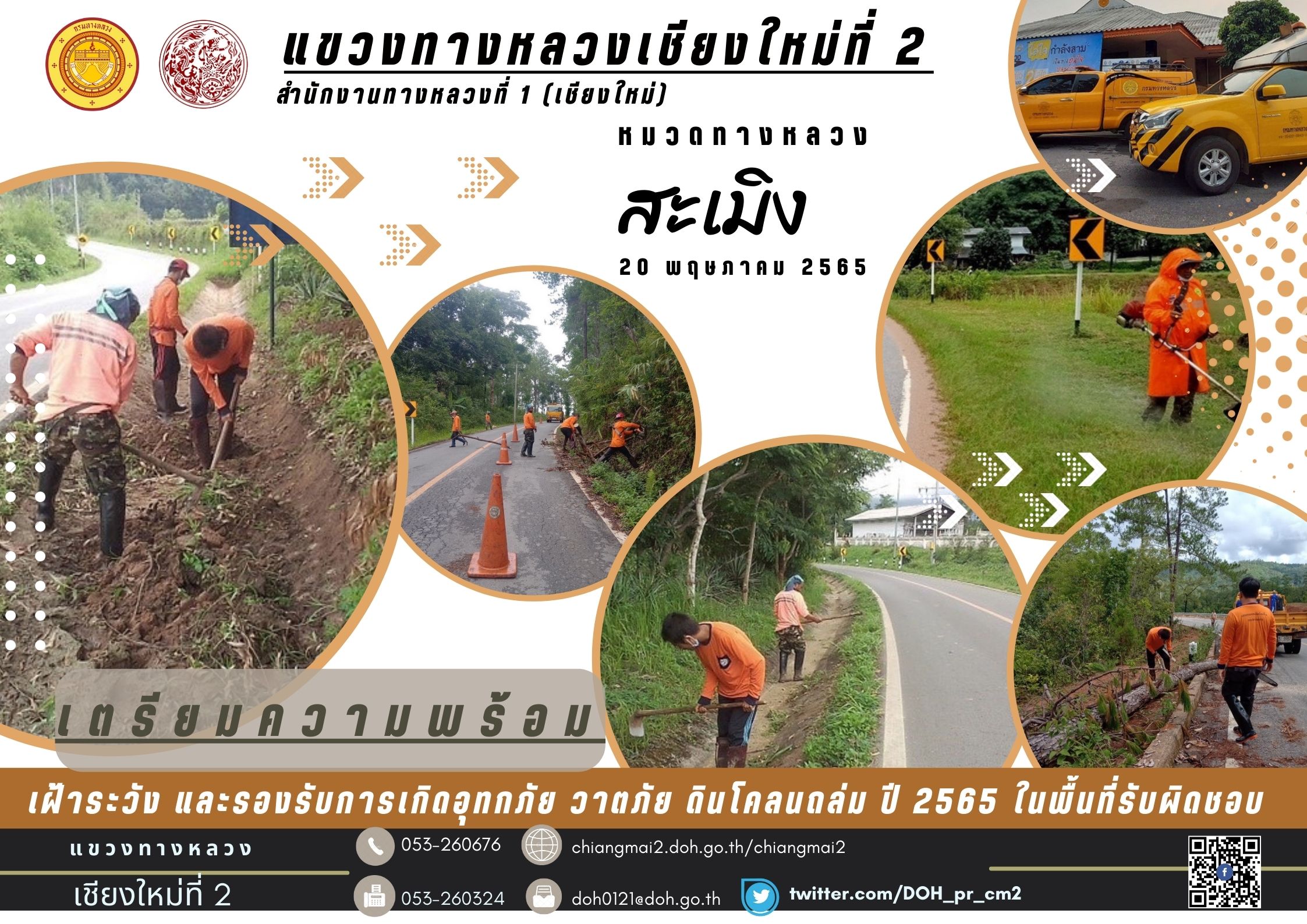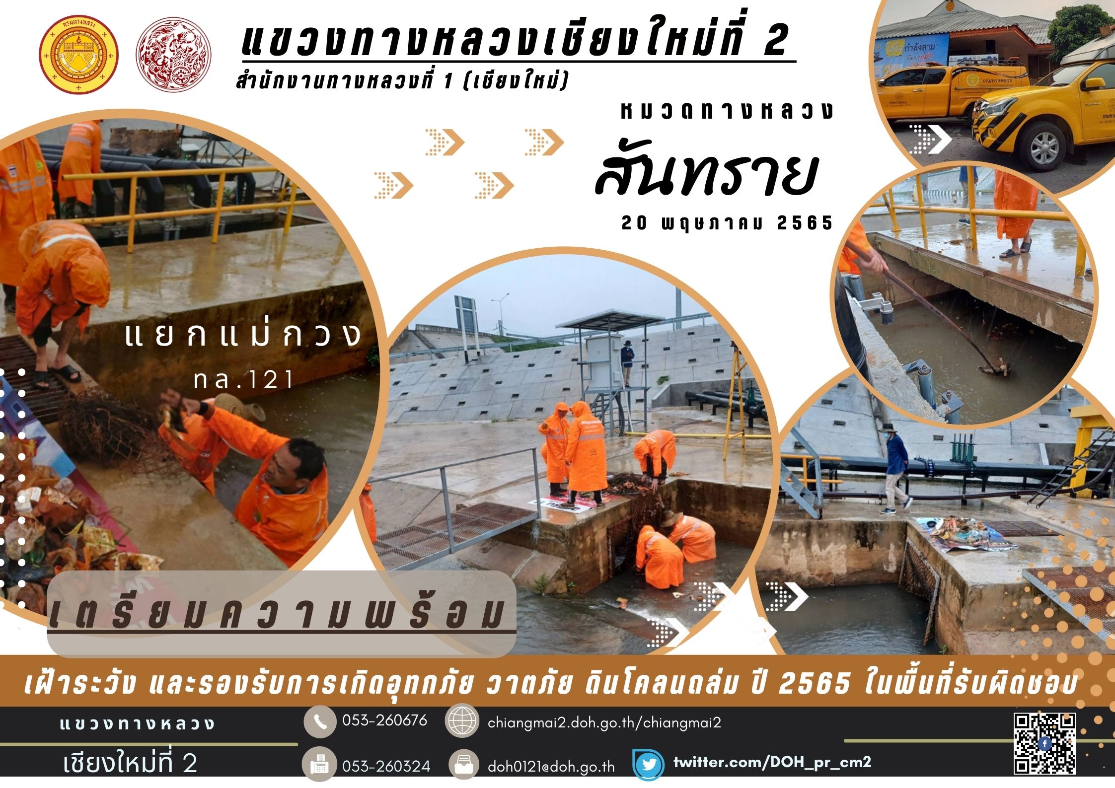 นายนิคม เทพบุตร ผู้อำนวยการแขวงทางหลวงเชียงใหม่ที่ 2 สั่งการทุกหน่วยงานในสังกัด เตรียมความพร้อม เฝ้าระวัง และรองรับการเกิดอุทกภัย วาตภัย ดินโคลนถล่ม ปี 2565 โดยให้เจ้าหน้าที่ในสังกัดลงพื้นที่เฝ้าระวังดูแลเส้นทางรับผิดชอบ ตลอดจนดูแลเก็บเศษใบไม้ และขยะอุดตัน ตามตะแกรงระบายน้ำ ฝาท่อระบายน้ำ เพื่ออำนวยความสะดวกแก่ผู้ใช้รถใช้ถนนในการเดินทางสัญจร