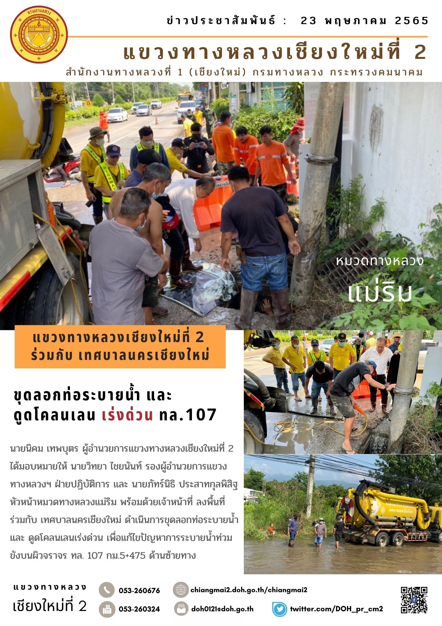 นายนิคม เทพบุตร ผู้อำนวยการแขวงทางหลวงเชียงใหม่ที่ 2 ได้มอบหมายให้ นายวิทยา ไชยนันท์ รองผู้อำนวยการแขวงทางหลวงฯ ฝ่ายปฏิบัติการ และ นายภัทร์นิธิ ประสาทกุลพิสิฐ หัวหน้าหมวดทางหลวงแม่ริม พร้อมด้วยเจ้าหน้าที่ ลงพื้นที่ร่วมกับ เทศบาลนครเชียงใหม่ ดำเนินการขุดลอกท่อระบายน้ำ และ ดูดโคลนเลนเร่งด่วน เพื่อแก้ไขปัญหาการระบายน้ำท่วมขังบนผิวจราจร ทล.107 ทางหลวงเพื่อประชาชน