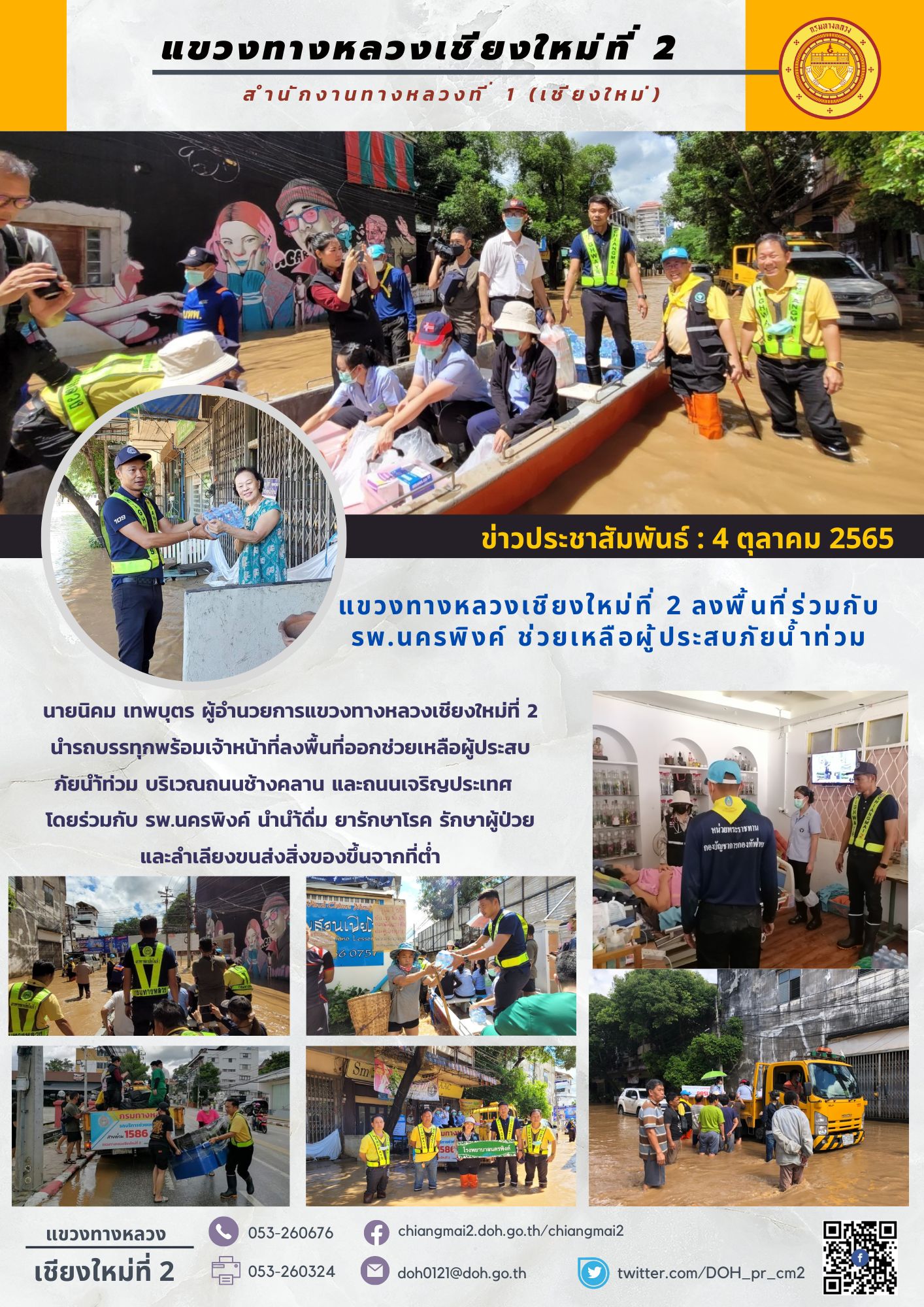 ข้อมูลข่าว : แขวงทางหลวงเชียงใหม่ที่ 2 ลงพื้นที่ร่วมกับ รพ.นครพิงค์ ช่วยเหลือผู้ประสบภัยน้ำท่วม