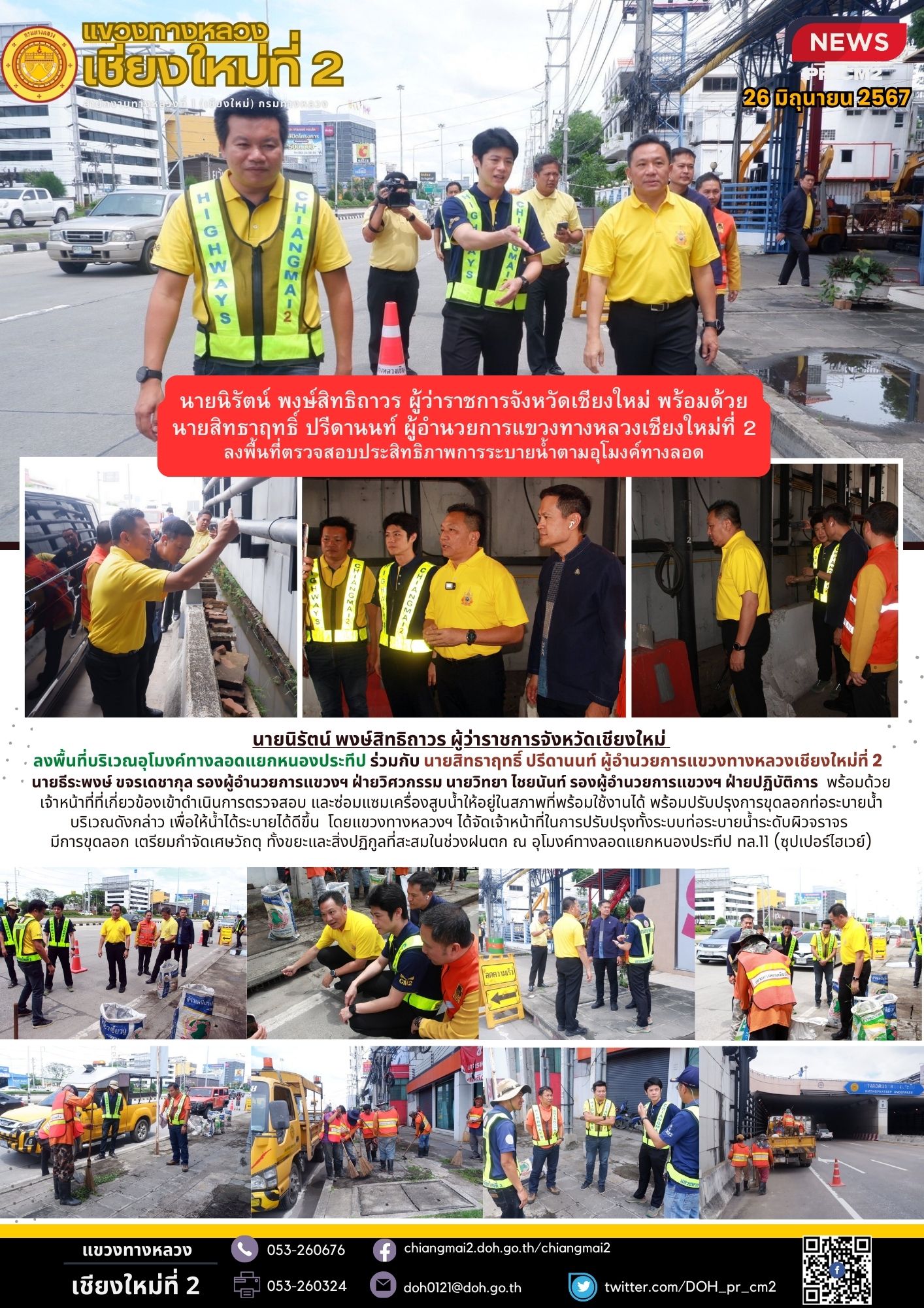 ผวจ.เชียงใหม่ ร่วมกับแขวงทางหลวงเชียงใหม่ที่ 2 ลงพื้นที่ตรวจสอบประสิทธิภาพการระบายน้ำตามอุโมงค์ทางลอด