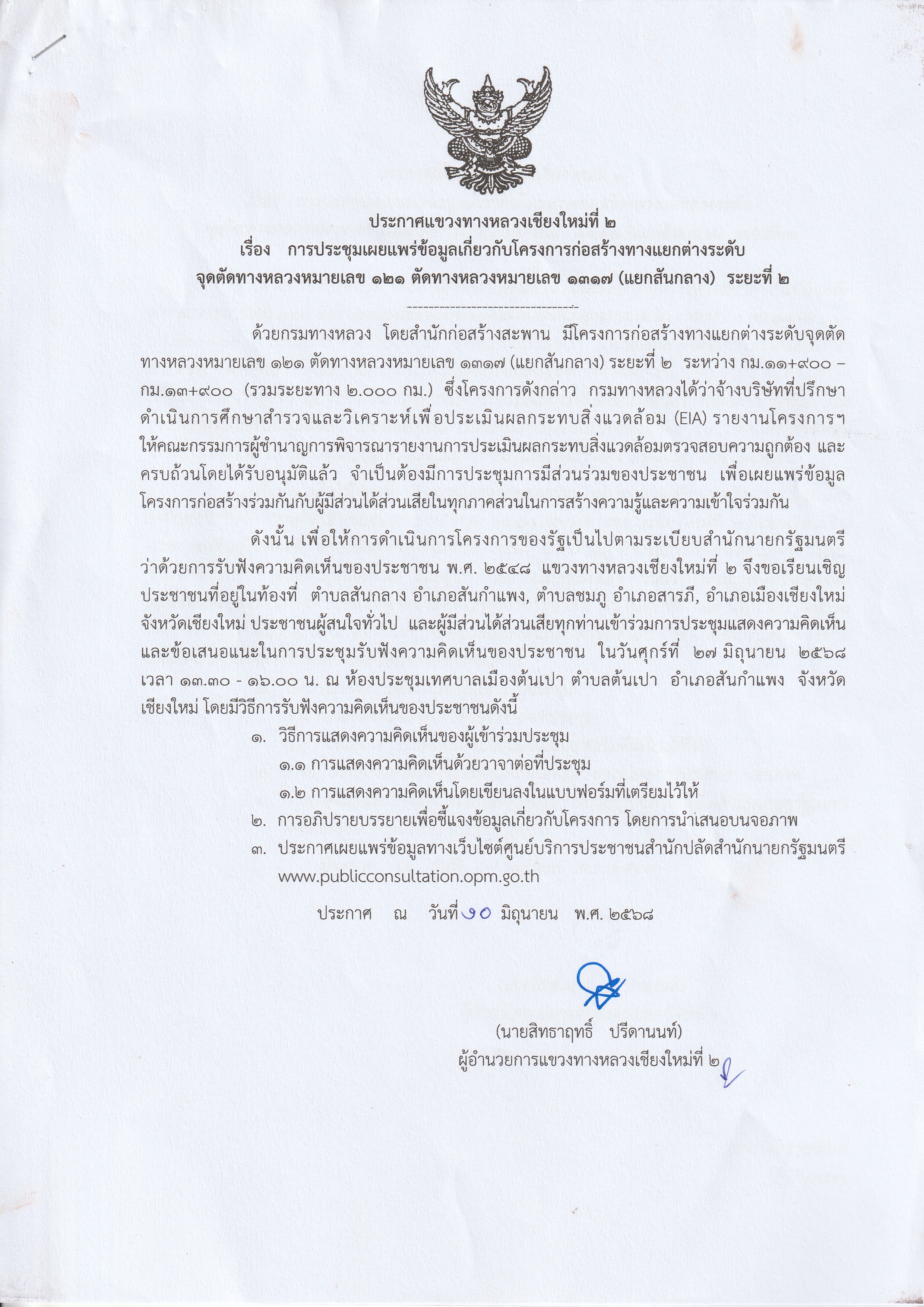 ดังนั้น เพื่อให้การดำเนินการโครงการของรัฐเป็นไปตามระเบียบสำนักนายกรัฐมนตรีว่าด้วยการรับฟังความคิดเห็นของประชาชน พ.ศ. 2548 แขวงทางหลวงเชียงใหม่ที่ 2 จึงขอเรียนเชิญประชาชนที่อยู่ในท้องที่ ตำบลสันกลาง อำเภอสันกำแพง, ตำบลชมภู อำเภอสารภี, อำเภอเมืองเชียงใหม่ จังหวัดเชียงใหม่ ประชาชนผู้สนใจทั่วไป และผู้มีส่วนได้ส่วนเสียทุกท่านเข้าร่วมการประชุมแสดงความคิดเห็นและข้อเสนอแนะในการประชุมรับฟังความคิดเห็นของประชาชน ในวันศุกร์ที่ 27 มิถุนายน 2568 เวลา 13.30 - 16.00 น. ณ ห้องประชุมเทศบาลเมืองต้นเปา ตำบลต้นเปา อำเภอสันกำแพง จังหวัดเชียงใหม่ โดยมีวิธีการรับฟังความคิดเห็นของประชาชนดังนี้