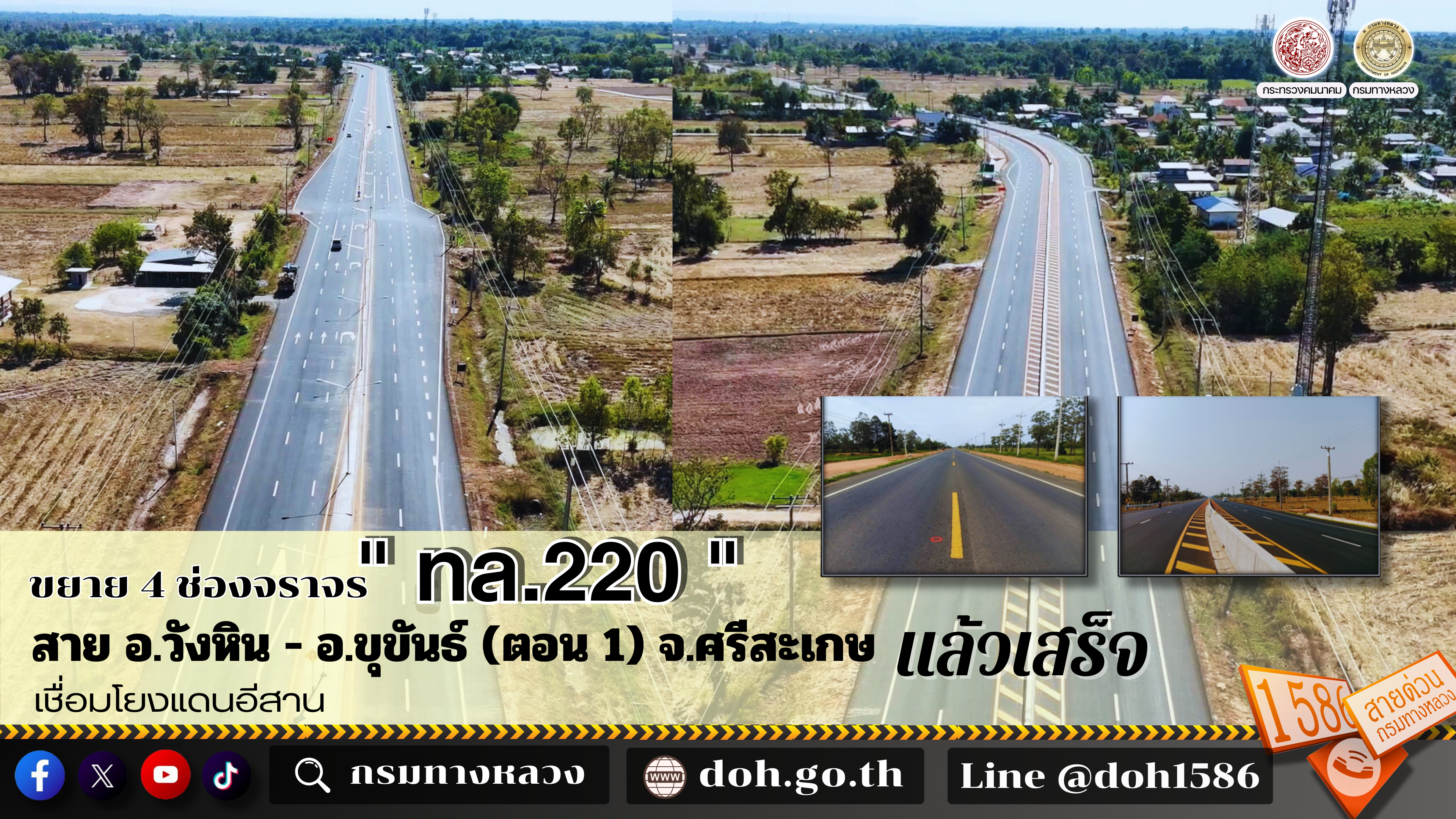 ขยาย 4 ช่องจราจร ทล.220 สาย อ.วังหิน - อ.ขุขันธ์ ตอน 1 จ.ศรีสะเกษ แล้วเสร็จ เชื่อมโยงแดนอีสาน