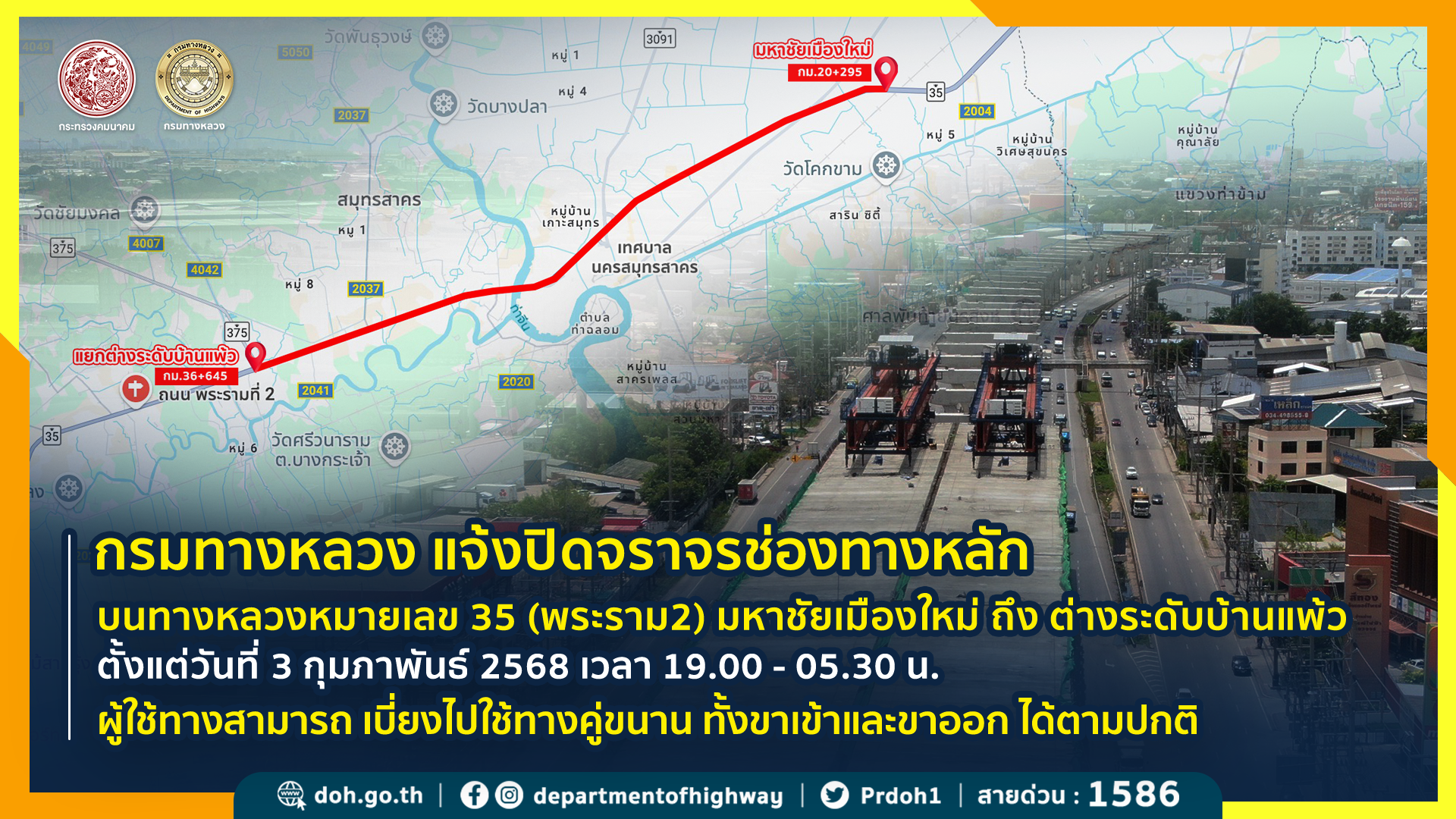 เพื่อให้การก่อสร้างเป็นไปอย่างต่อเนื่อง จึงมีความจำเป็นต้องปรับแผนการจราจรบนทางหลวงหมายเลข 35 (ถนนพระรามที่ 2) ตั้งแต่วันที่ 3 กุมภาพันธ์ 2568 เป็นต้นไป โดยจะ ปิดช่องจราจรหลัก ช่วง กม.ที่ 20+295 (มหาชัยเมืองใหม่ ) - กม.ที่ 36+645 (แยกต่างระดับบ้านแพ้ว) อ.เมือง จ.สมุทรสาคร ในช่วงเวลากลางคืน (ทุกคืน) จากเดิมเวลา 20.00 น. - 05.30 น. มาเป็นเวลา 19.00 น. - 05.30 น. โดยผู้ใช้ทางสามารถ เบี่ยงไปใช้ทางคู่ขนาน ทั้งขาเข้าและขาออก ได้ตามปกติ