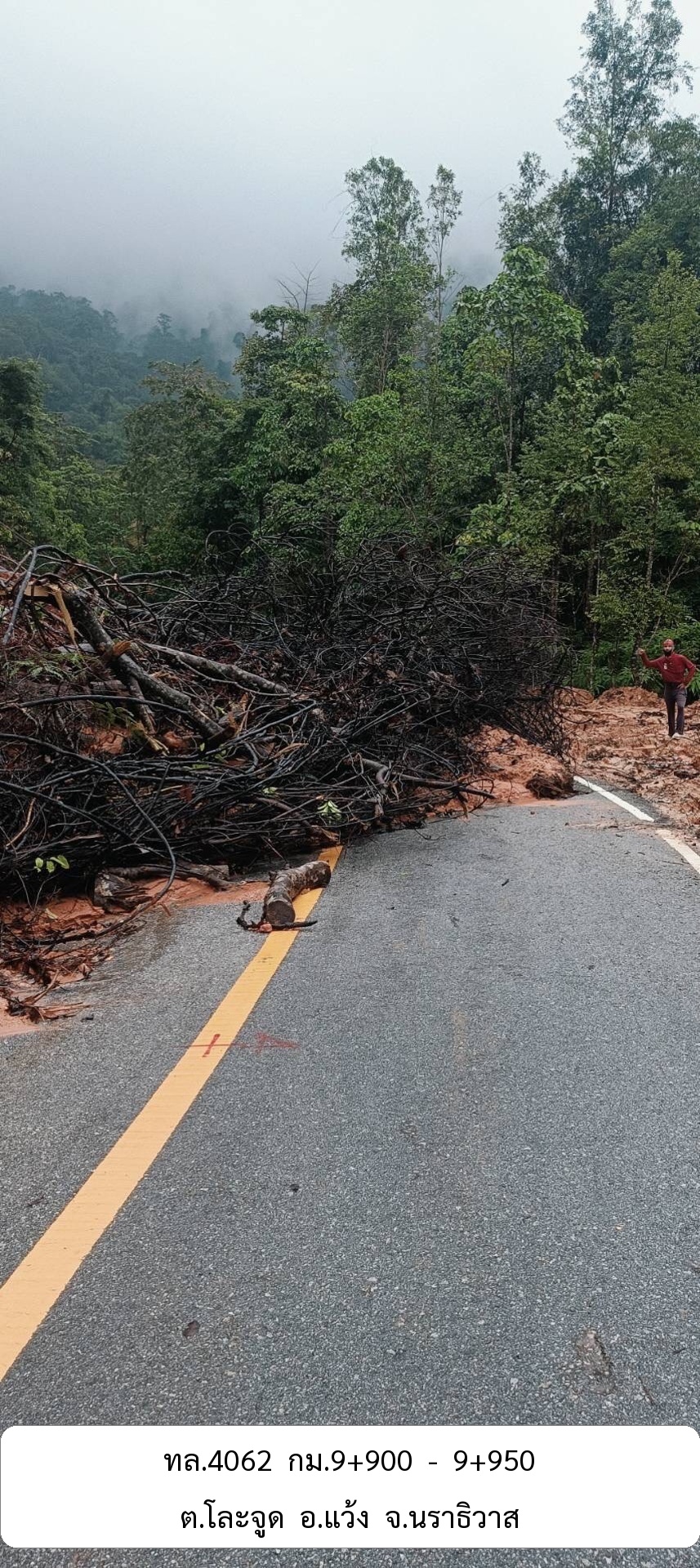 1. ทางหลวงหมายเลข 4062 อ.แว้ง สายบูเก๊ะตา - สอวอนอก กม.ที่ 90+900 -9+950 ดินสไลด์ปิดทับผิวทาง 2 ช่องจราจร สามารถใช้ทางเลี่ยง ทช.4115 เข้า ทล. 4207 แทน