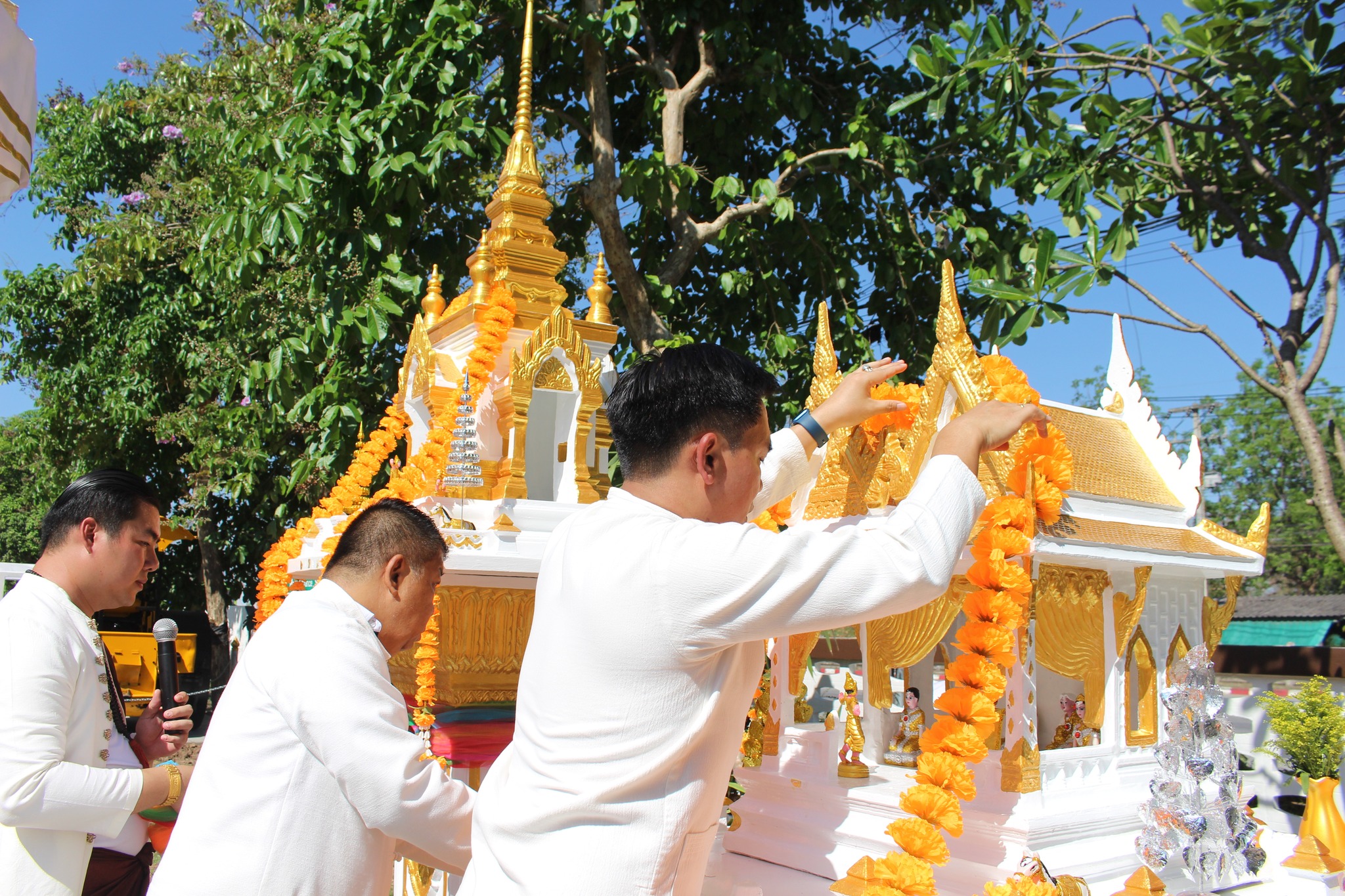 ร่วมการประกอบพิธีทางศาสนา ตั้งแท่นศาลพระภูมิ ประทับประดิษฐาน (พิธีตั้งแท่นศาลพระภูมิที่ใหม่) ศาลพระภูมิและศาลตาศาลยาย พร้อมเครื่องสังเวยและของมงคลสำหรับฝังใต้ฐานศาล โดยมีพราหมณ์ นำพิธีการ