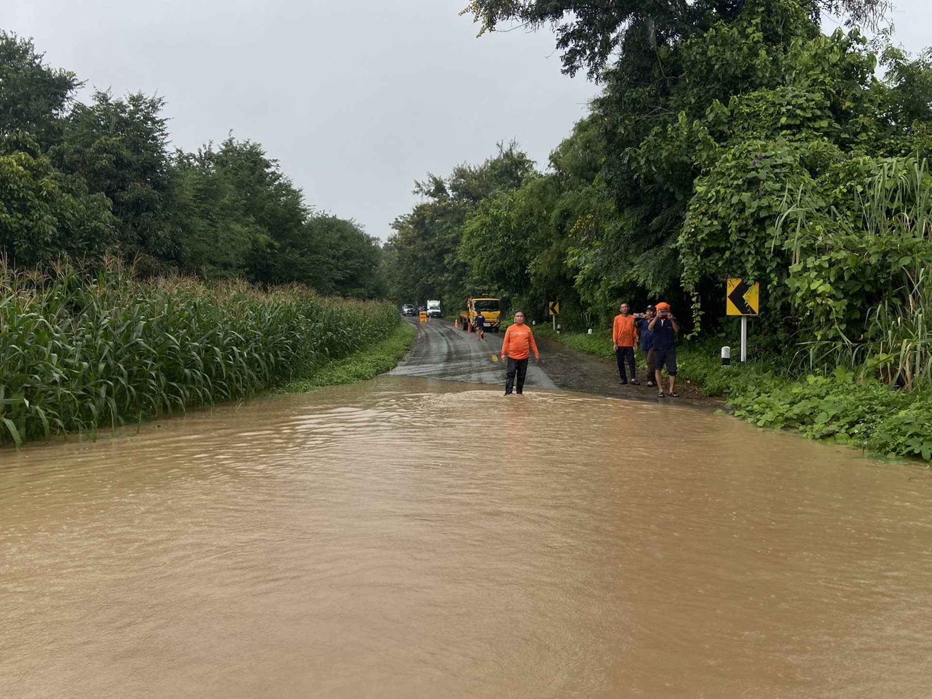 เนื่องจากฝนตกเป็นเวลานานทำให้น้ำในลำห้วยแม่ลี้ เอื่อล้นท้วมผิวทางจราจร 40 เซ็นติเมตร