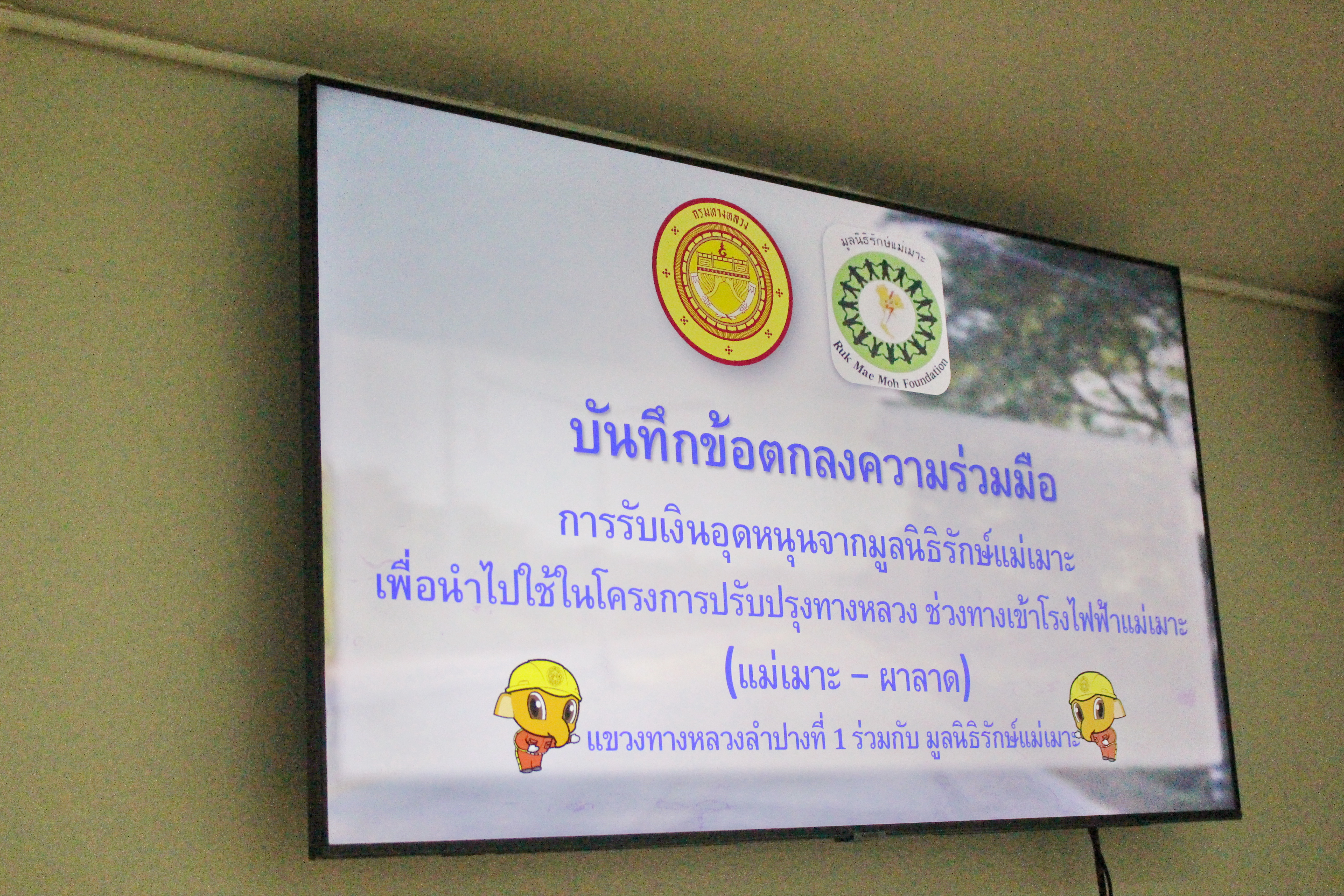ร่วมกับ คณะกรรมการมูลนิธิรักษ์แม่เมาะ ได้แก่นาย สมมุติ หาลือ ประธานมูลนิธิรักษ์แม่เมาะ และ นางสุนทรี วงศ์เปี้ย เลขานุการมูลนิธิรักษ์แม่เมาะ ร่วมบันทึกข้อตกลงความร่วมมือการรับเงินอุดหนุนจากมูลนิธิรักษ์แม่เมาะ เพื่อนำไปใช้ในโครงการปรับปรุงทางหลวง ช่วงทางเข้าโรงไฟฟ้าแม่แมาะ ทางหลวงหมายเลข 1348 ตอนทางเข้าโรงไฟฟ้าแม่เมาะงานปรับระดับผิวทาง กม.11+200 - กม.11+515 และ กม.13+220 - กม.13+535 เพื่อปรับปรุงทางหลวงให้มีประสิทธิภาพด้านการจราจรและอำนวยความปลอดภัยแก่ผู้ใช้เส้นทาง