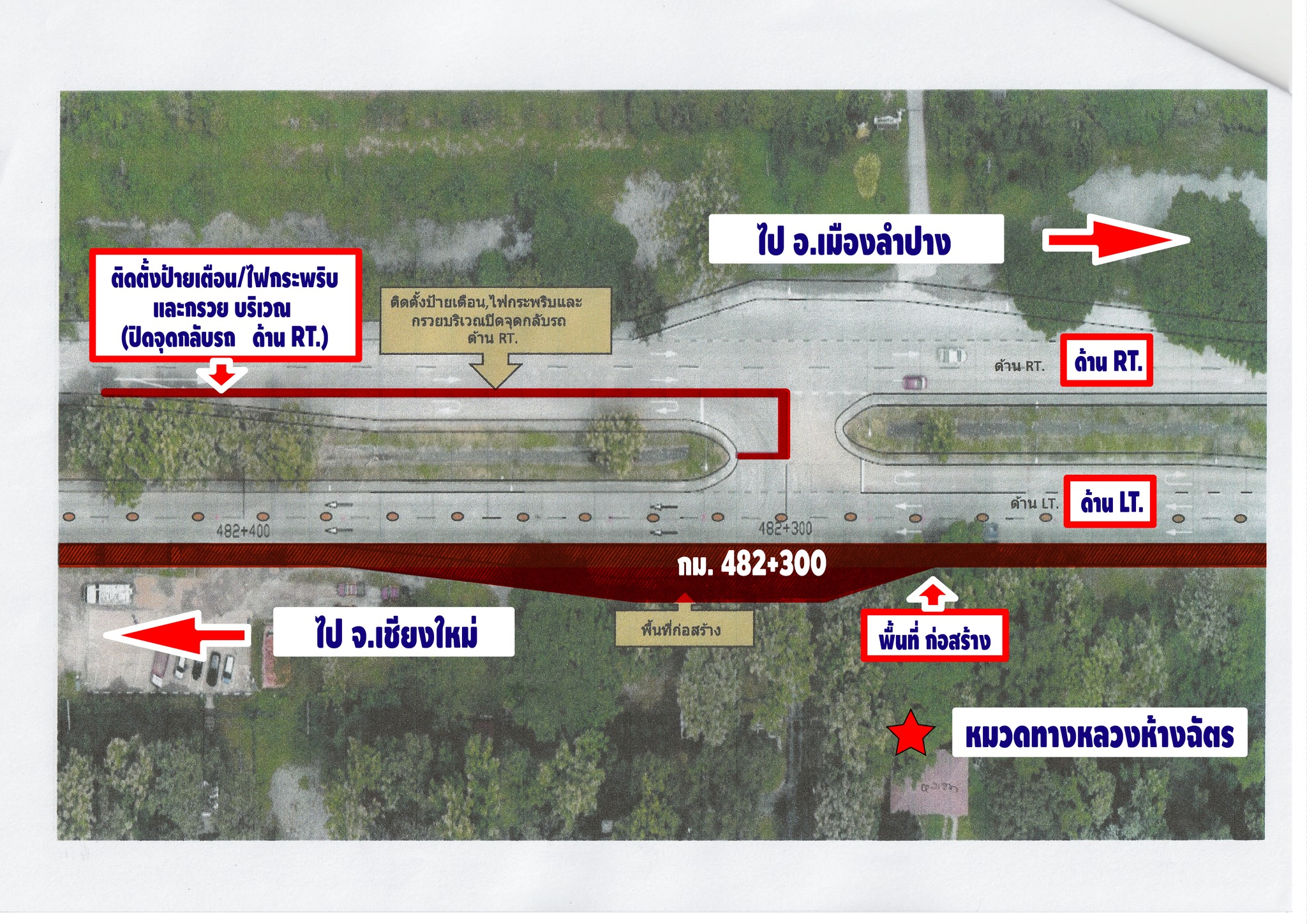 (ปิดจุดกลับรถชั่วคราว) บริเวณฯ หน้าหมวดทางหลวงห้างฉัตร กม.๔๘๒+๓๐๐ (ด้าน RT. ขวาทาง)